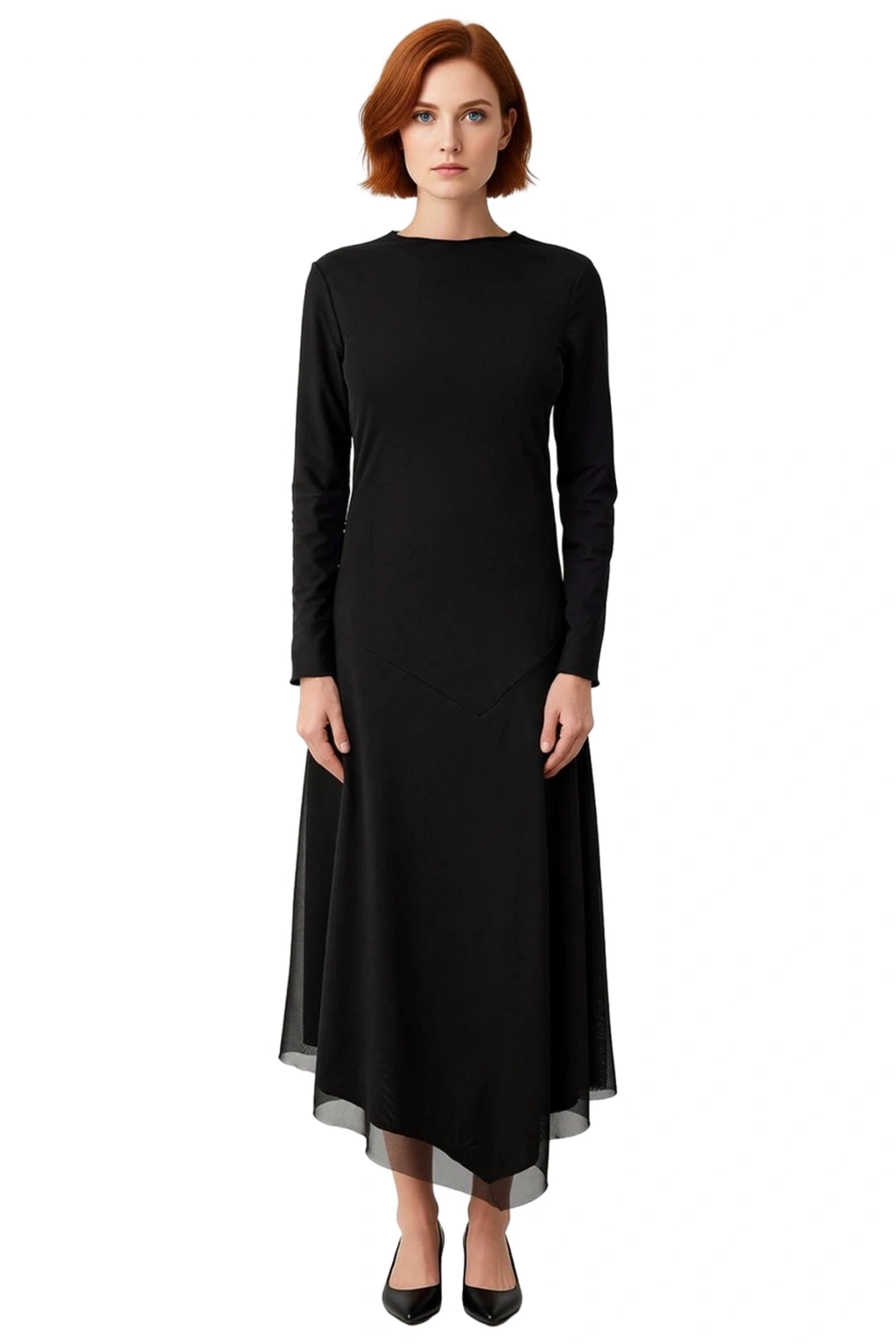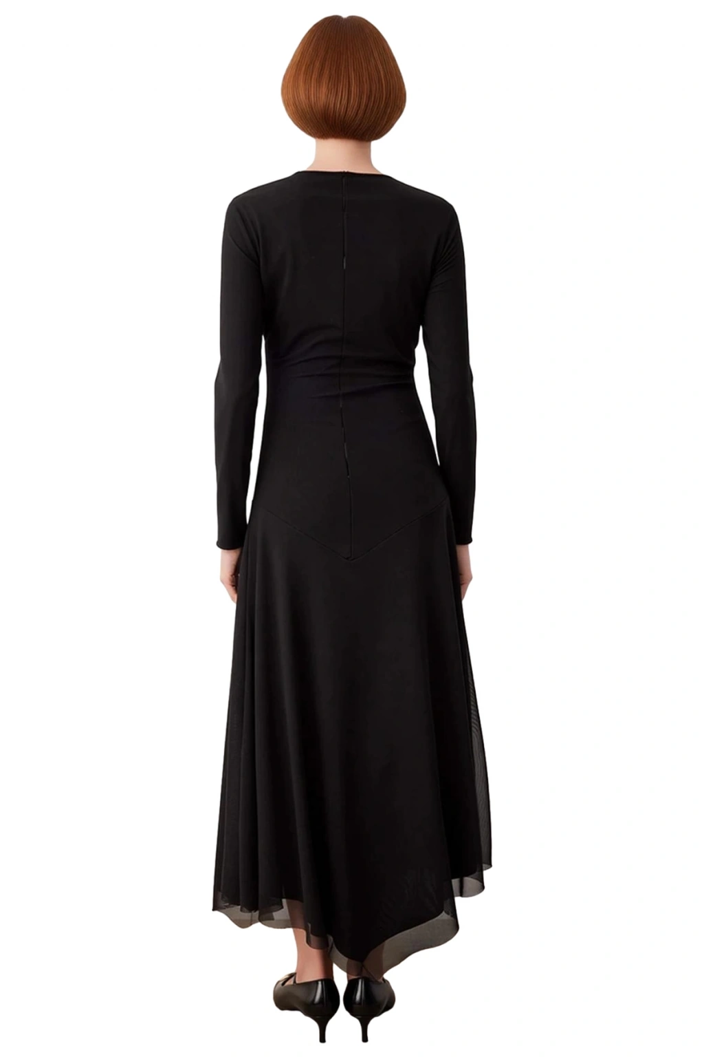 Ürün Özellikleri: Bodycon kalıp, polyester elastan karışımı materyal, düz desen, kayık yaka, standart kol, örme kumaş, siyah renk, astarlı, maxi boy, tül dokuma.