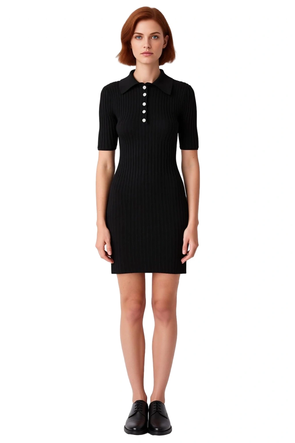Ürün Özellikleri: A-line kalıp, polyester materyal, düz desen, polo yaka, kısa kol, triko kumaş, siyah renk.