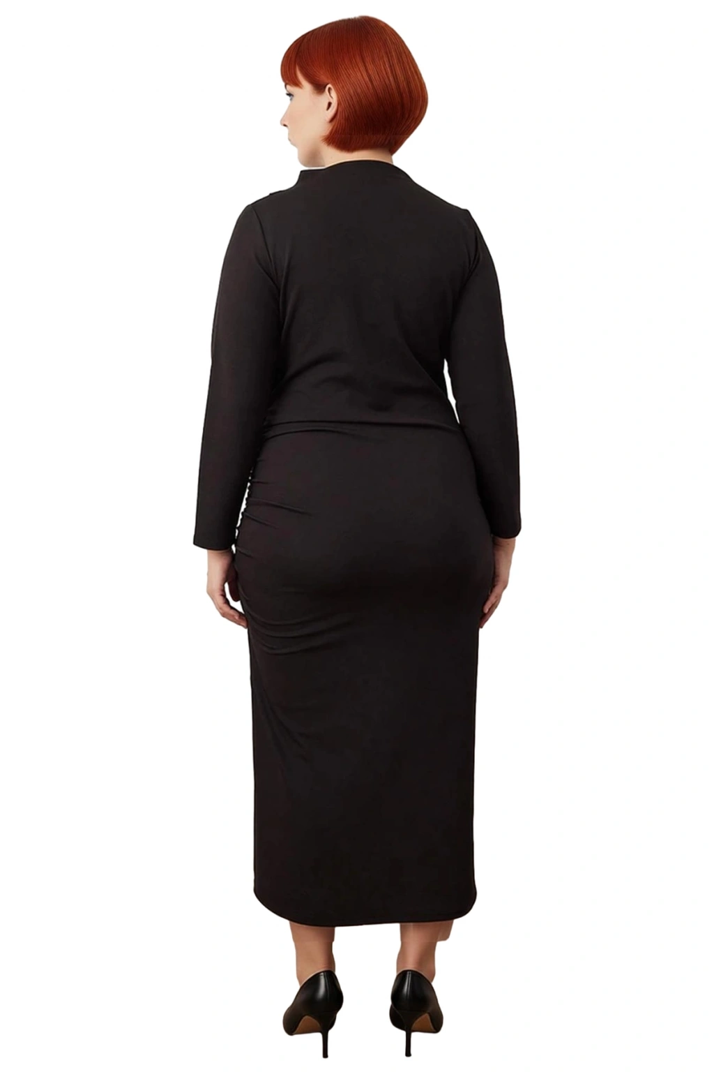 Bu şık Kadın Siyah Düz Desen Dik Yaka Maxi Boy Elbise, büyük beden giyimde zarafeti ve konforu birleştirir. Esnek ve yumuşak dokulu polyester elastan materyali (%96 polyester, %4 elastan) sayesinde gün boyu rahat bir kullanım sunarken, modern shift kalıbı her bedende kusursuz bir duruş sergiler. Düz deseni, minimalist ve zamansız bir estetik sunarak, siyah rengiyle gardırobunuzun vazgeçilmez parçası olmaya adaydır. Yırtmaç detayı ve yan büzgü uygulaması, elbiseye hareket katarken, soğuk kış günlerinde bile stil sahibi görünmenizi sağlar.