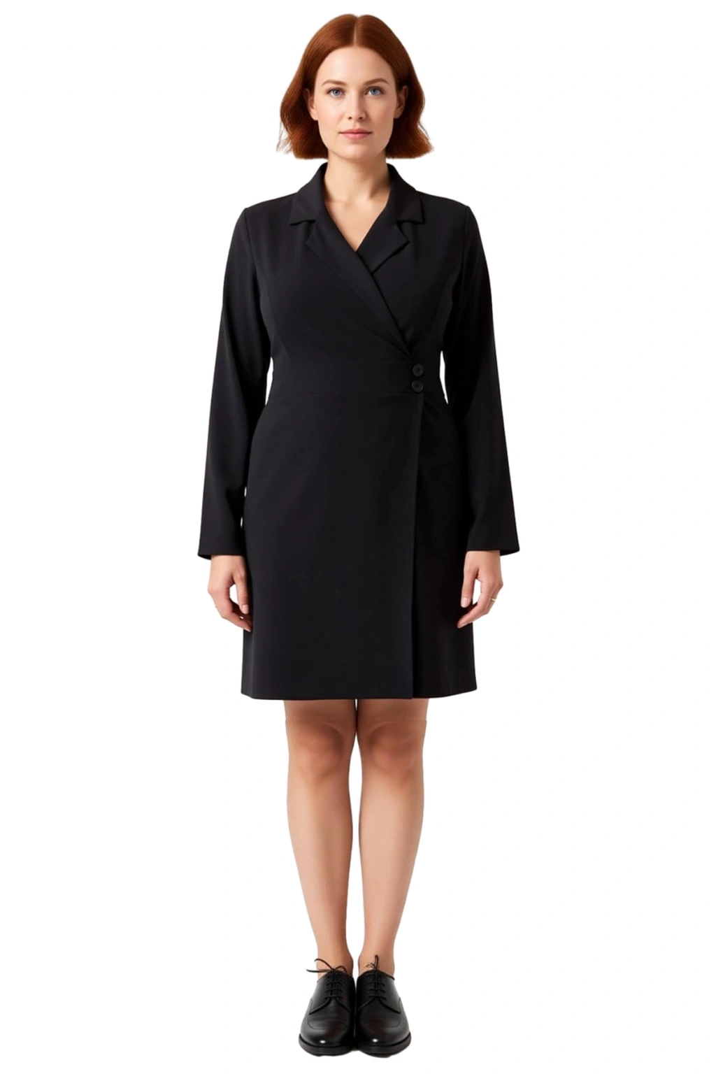 Bu şık ceket elbise, her vücut tipine uyum sağlayan büyük beden kesimi ile her kadının kendini özel hissetmesini sağlar. Topuklu ayakkabılar ve minimalist aksesuarlarla kombinleyerek sofistike bir tarz yaratabilirsiniz. Özellikle ilkbahar, sonbahar ve hafif kış aylarında, geçiş mevsimlerinin serin havalarında rahatlıkla tercih edilebilir. Hem iş ortamında hem de özel akşam yemeklerinde stilinizi tamamlayacak ideal bir seçenektir.