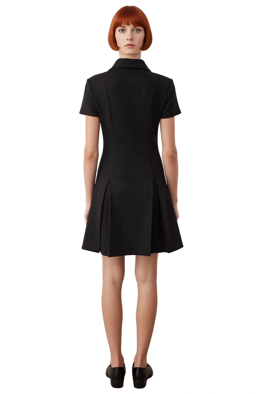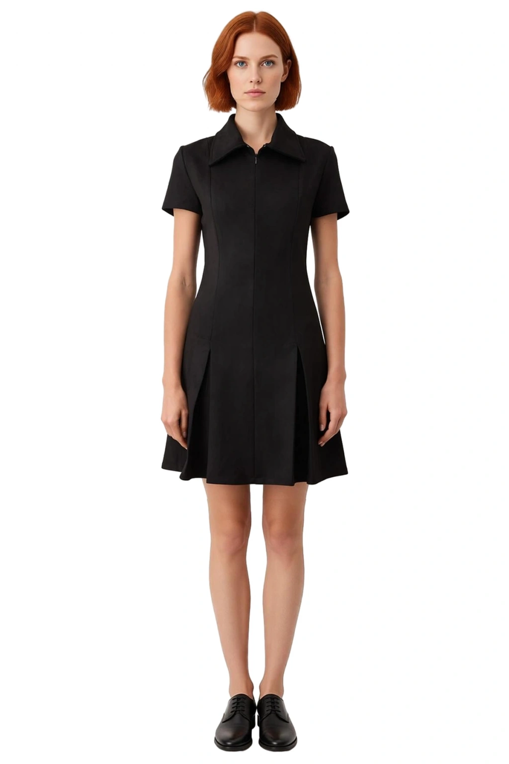 Ürün Özellikleri: A-line kalıp, polyester elastan materyal, düz desen, gömlek yaka, standart kısa kol, örme süet dokulu kumaş, siyah renk, yarım pat fermuar.