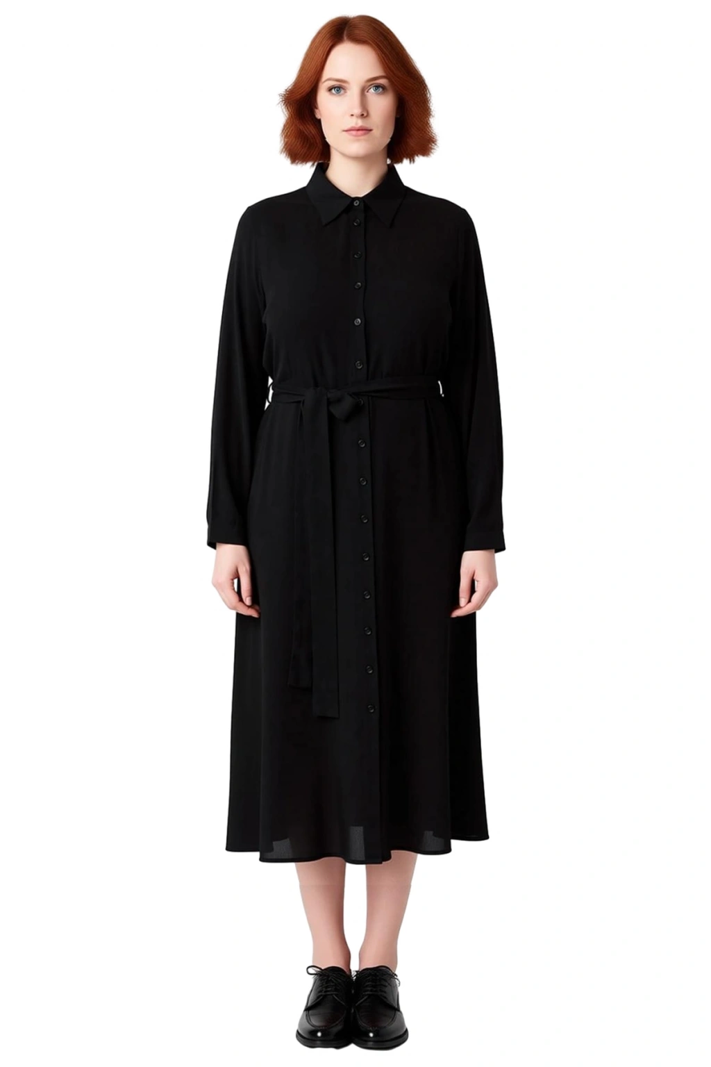 Ürün Özellikleri: Gömlek elbise kalıp, viskoz materyal, düz desen, gömlek yaka, standart kol, dokuma kumaş, siyah renk.