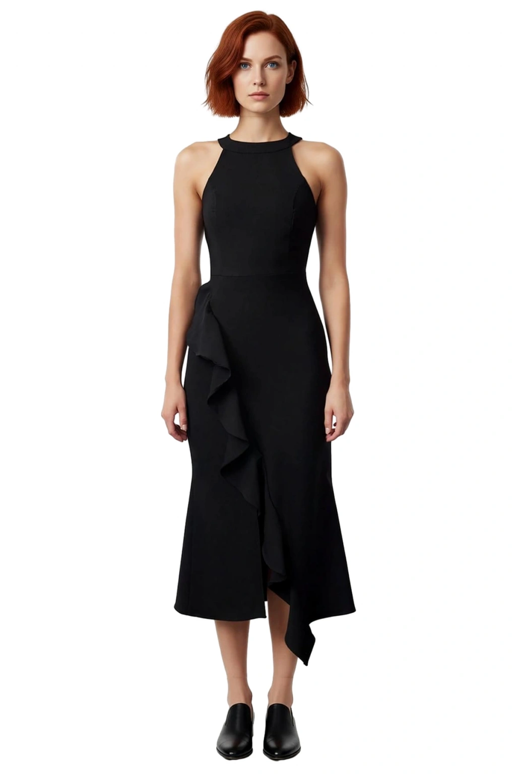 Bu göz alıcı kadın siyah abiye elbise, vücudu saran balık kesim kalıbıyla feminen hatları mükemmel bir şekilde vurgulayarak özel davetlerde tüm dikkatleri üzerinize çeker. Polyester karışımlı dokuma kumaşı sayesinde hem zarif bir duruş sergiler hem de gün boyu konfor sunar. Halter yaka tasarımı modern bir şıklık katarken, yan kısmındaki volanlı ve fırfırlı detaylar elbiseye dinamik ve asimetrik bir hareketlilik kazandırır. Düz siyah rengi, asaleti ve zamansız zarafeti bir araya getirerek her türlü aksesuarla kolayca uyum sağlar. Astarlı yapısı sayesinde iç göstermez ve kusursuz bir giyim deneyimi sunar.