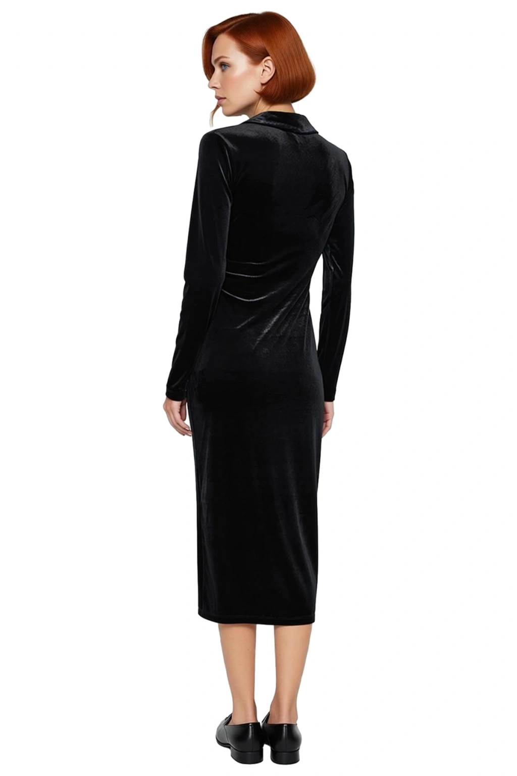Ürün Özellikleri: Bodycon kalıp, polyester karışımlı materyal, düz desen, polo yaka, uzun standart kol, örme kadife kumaş, siyah renk, baskısız tasarım, büzgü/drape detaylı.