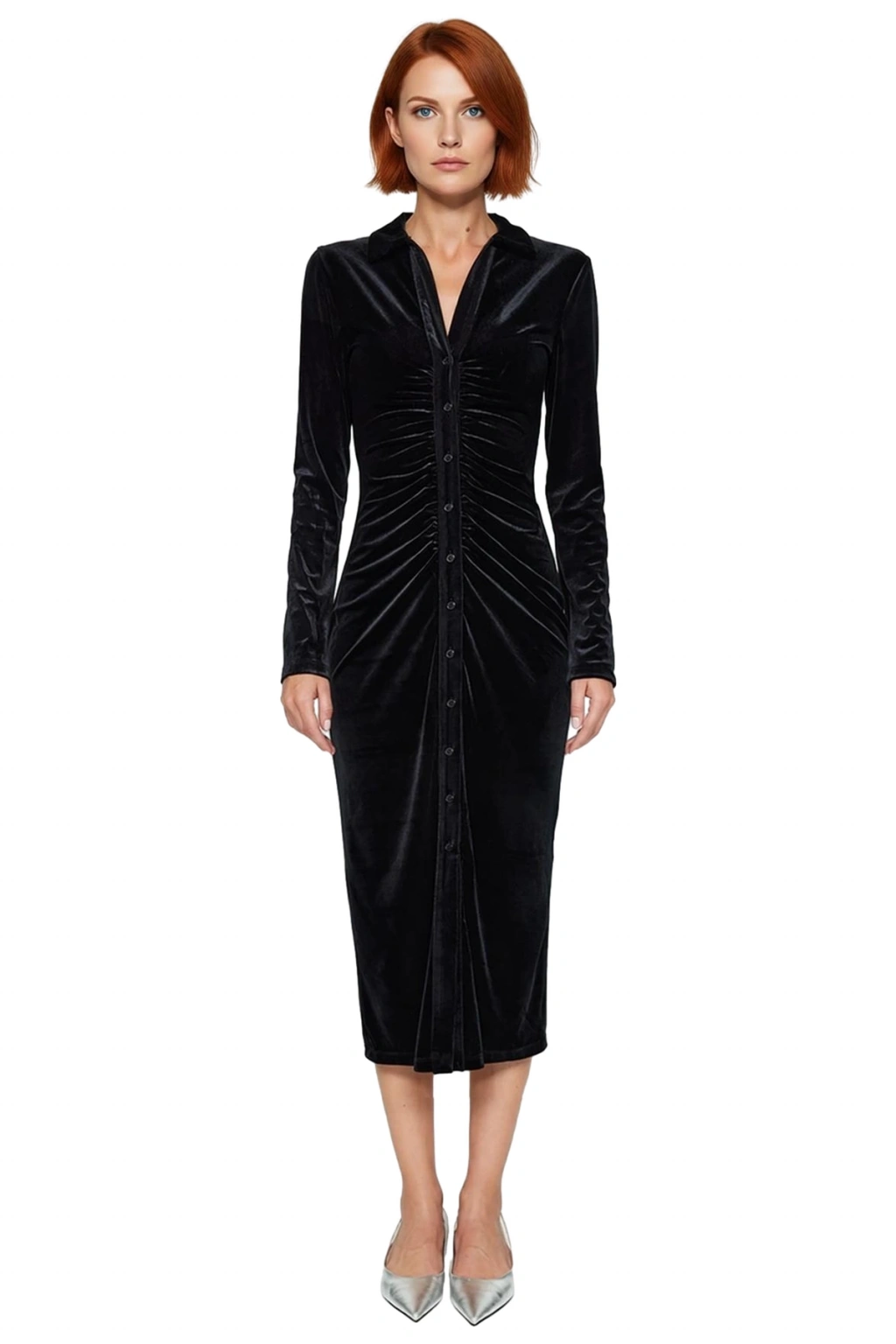 Ürün Özellikleri: Bodycon kalıp, polyester karışımlı materyal, düz desen, polo yaka, uzun standart kol, örme kadife kumaş, siyah renk, baskısız tasarım, büzgü/drape detaylı.