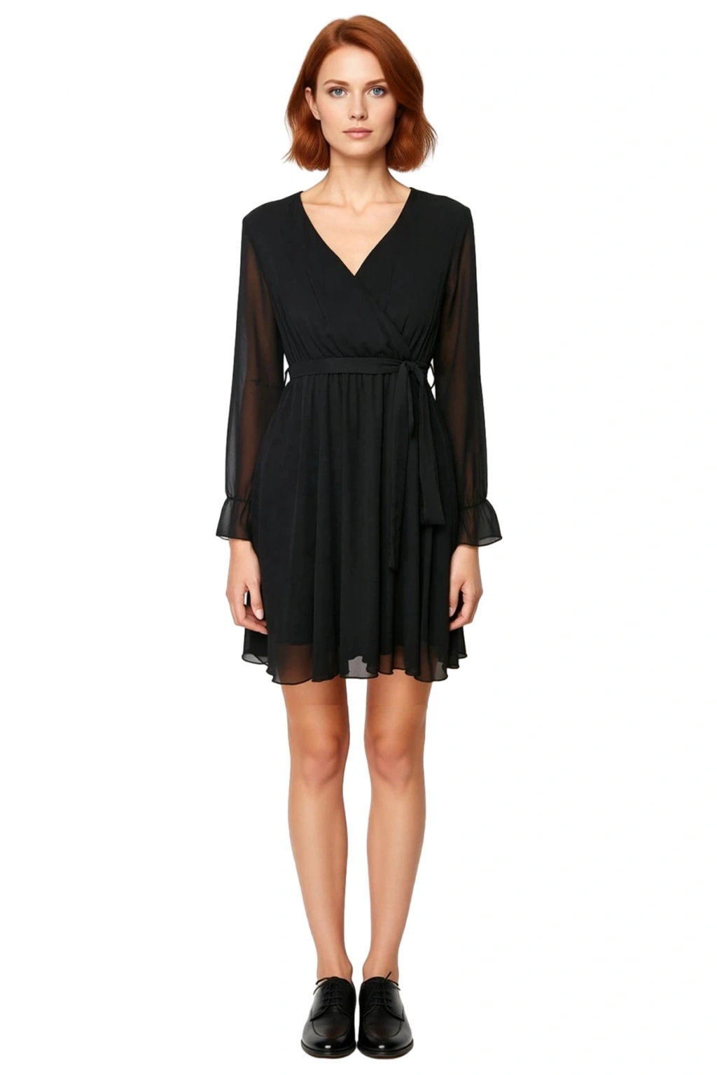 Ürün Özellikleri: Skater kalıp, dokuma materyal, düz desen, kruvaze yaka, balon kol, şifon kumaş, siyah renk, astarlı, kuşaklı, mini boy.