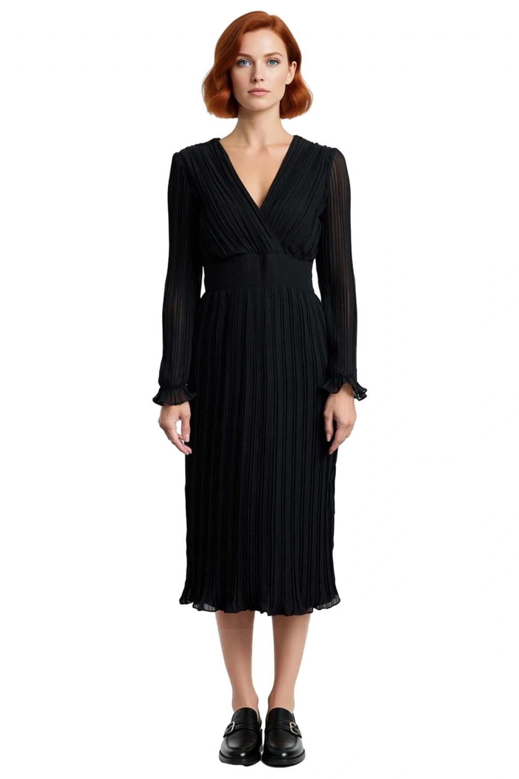 Ürün Özellikleri: A-line kalıp, %100 polyester materyal, düz desen, kruvaze yaka, uzun standart kol, dokuma şifon kumaş, siyah renk, piliseli detay, astarlı, kuşaklı, midi boy, baskısız tasarım.
