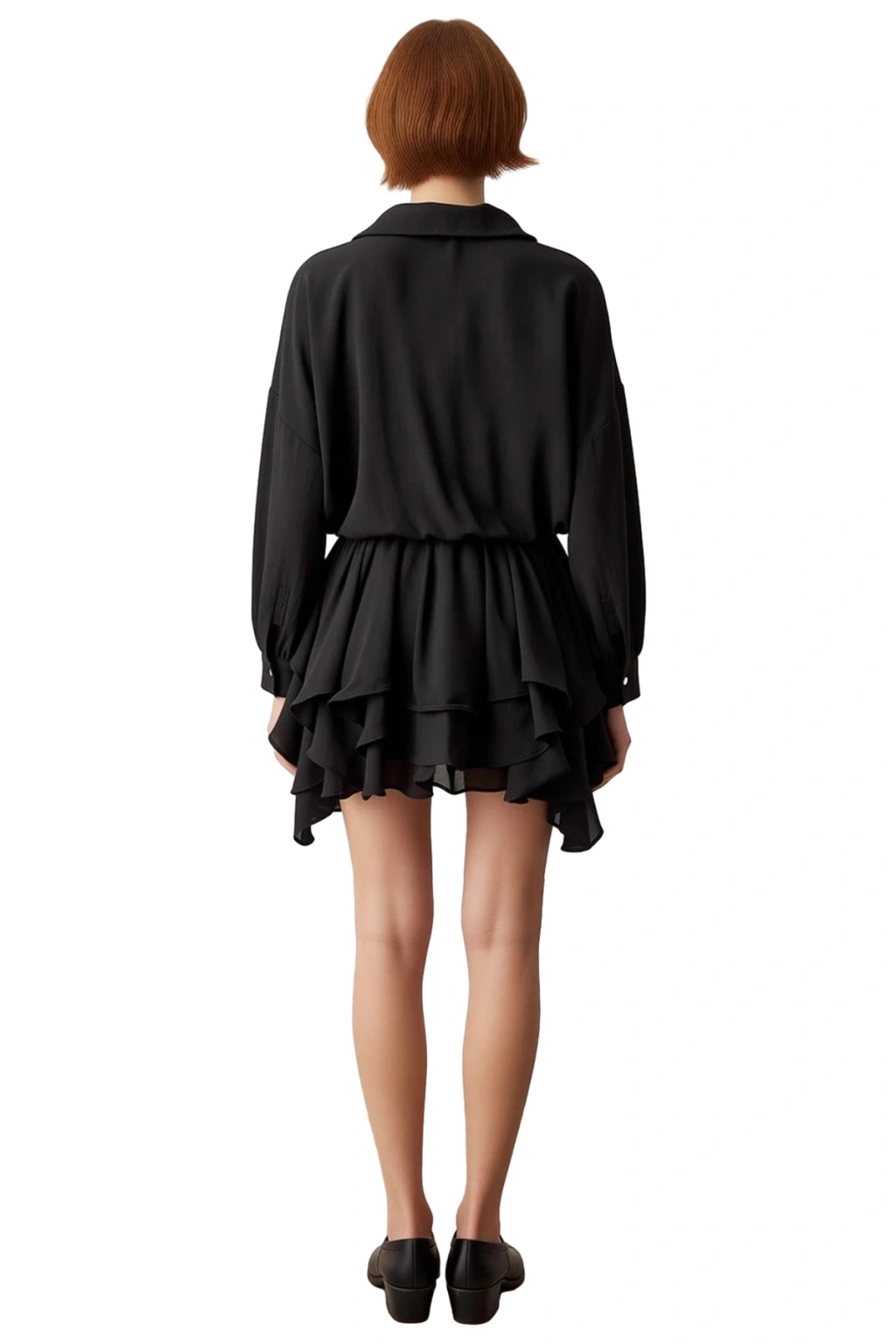 Ürün Özellikleri: Gömlek yaka, mini boy, düşük kol, uzun kol, skater kalıp, düz desen, siyah renk, şifon kumaş, %100 polyester, astarlı, günlük kullanım.