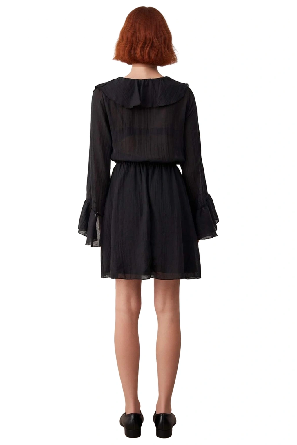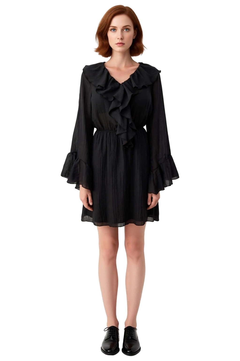 V yaka tasarımı, boynunuzu zarifçe vurgulayarak dekolteye modern bir dokunuş katarken, ön ve omuz bölgelerindeki katmanlı fırfır detayları elbiseye hareketli ve romantik bir hava katar. Uzun standart kol tipi, hem şıklığı hem de örtücülüğü bir araya getirerek farklı hava koşullarına uyum sağlar ve zarif bir bitiş sunar. Dokuma kumaş yapısı, hafif ve nefes alabilen özelliğiyle sıcak havalarda bile serin ve konforlu bir kullanım deneyimi sunar. Özellikle lilyum dokuma tipi, kumaşa özgün bir doku ve dayanıklılık kazandırarak elbisenin uzun yıllar formunu korumasını sağlar. Makinede yıkanabilir özelliği ile bakımı oldukça kolay ve pratiktir, bu da onu yoğun tempolu günler için ideal kılar.