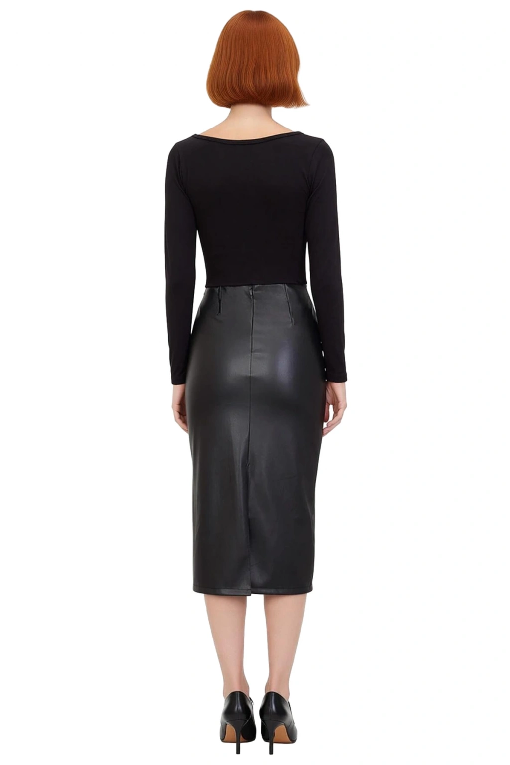 Ürün Özellikleri: Bodycon kalıp, suni deri materyal, düz desen, bisiklet yaka, standart kol, örme kumaş, siyah renk, kemerli tasarım.