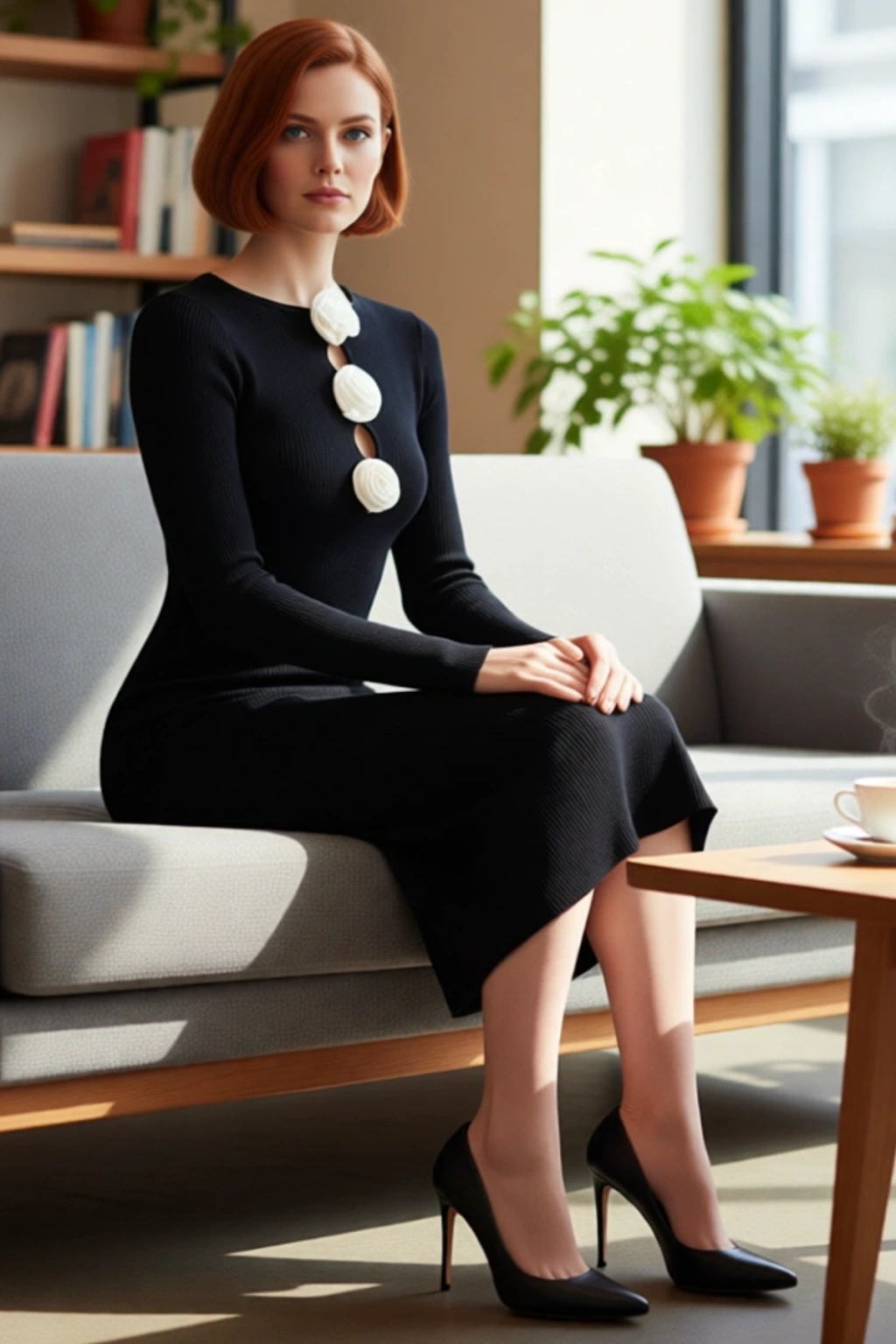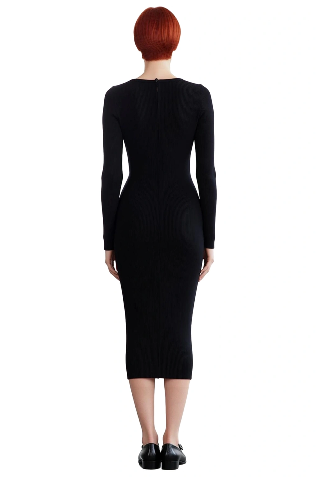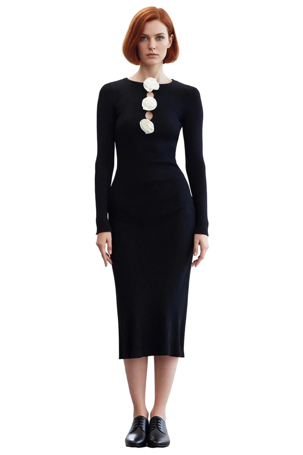 Ürün Özellikleri: Bodycon kalıp, triko materyal, gül detaylı desen, bisiklet yaka, uzun standart kol, ince triko kumaş, siyah renk, kemersiz.