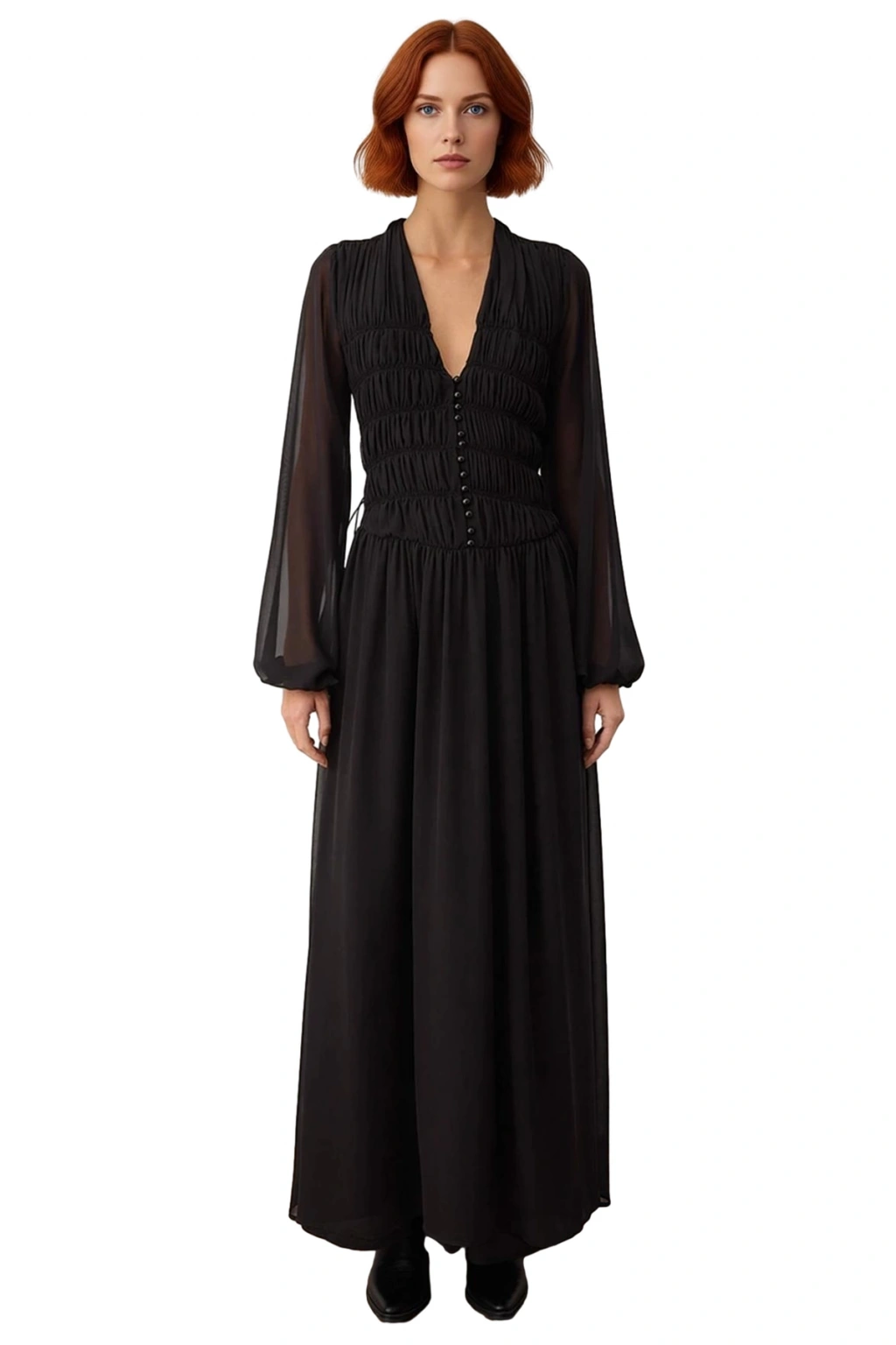 Büzgü detaylarıyla hareket kazanan bu siyah maxi elbise, V yaka kesimiyle feminen ve çağdaş bir duruş sergiler. Skater kalıbı, üst bedene oturan ve etek kısmında zarif bir dökülme sunan yapısıyla vücut hatlarını kusursuzca dengeleyerek modern bir siluet oluşturur. Hafif ve ince şifon dokuma kumaşı, polyester ve elastan karışımından elde edilen dayanıklı yapısıyla uzun ömürlü kullanım sunar. Astarlı tasarımı sayesinde iç göstermez, gün boyu kendinizi güvende ve rahat hissetmenizi sağlar. Düz deseni, minimalist ve şık bir görünüm arayan kadınlar için idealdir, her türlü kombine kolayca uyum sağlar.