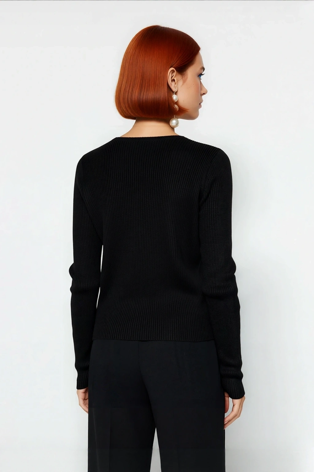 Ürün Özellikleri: Fitted kalıp, akrilik materyal, düz desen, V yaka, standart kol, triko kumaş, siyah renk.