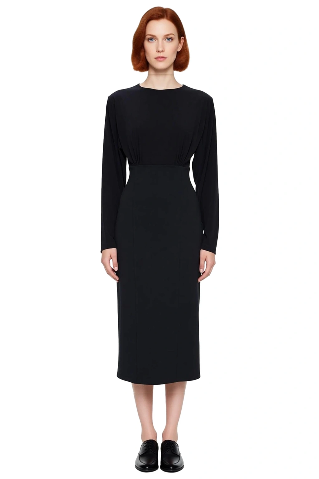 Bu zarif kadın elbisesi, dökümlü üst kısmı ve yarasa kol detayıyla modern bir siluet sunar. Uzun kolları ve midi boyu sayesinde kış aylarında hem sıcak tutar hem de şık bir görünüm sağlar. Vücudu saran bodycon kalıbı, feminen hatları kusursuzca ortaya çıkarırken, düz deseni ve derin siyah rengi asaletinizi pekiştirir. %95 polyester ve %5 elastan materyal bileşeni, gün boyu esneklik ve hareket özgürlüğü sunarak konforunuzdan ödün vermemenizi sağlar. Özellikle vatkalı omuz detayları, elbisenin karakterini güçlendirerek sofistike bir duruş kazandırır.