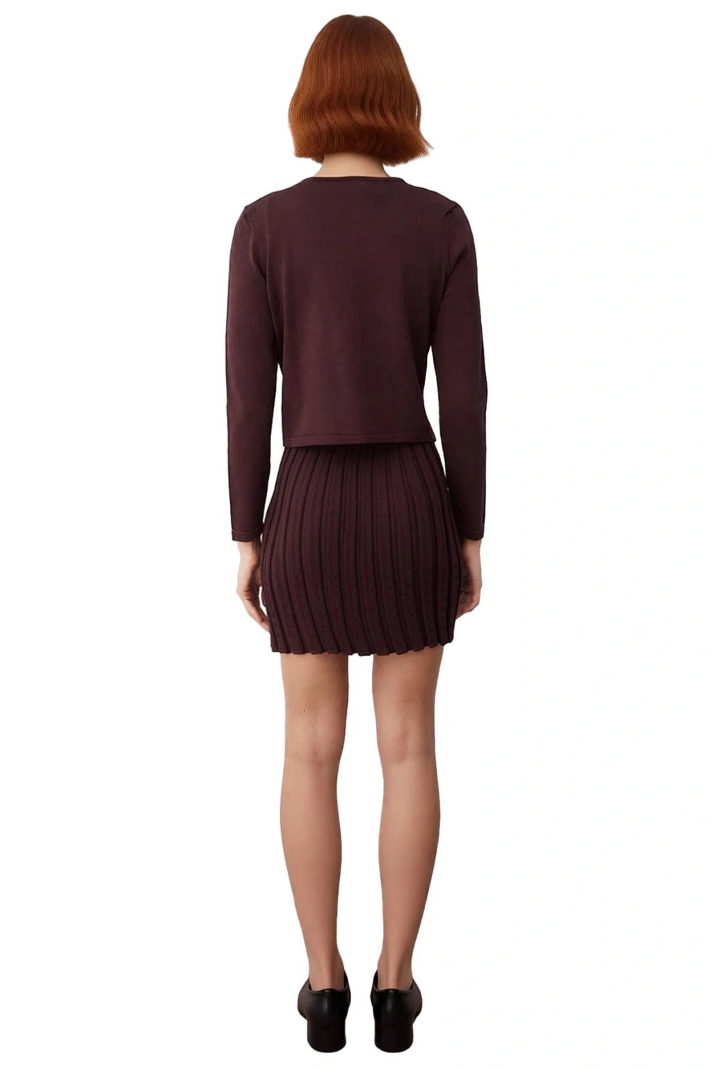 Bu zarif kadın triko ikili takım, skater kalıbı ile hem modern hem de rahat bir şıklık sunar. Vücuda hoş bir şekilde oturan üst kısmı ve hareketli etek kesimiyle dikkat çeken mini elbise, polyester ve viskoz karışımı triko materyali sayesinde gün boyu konfor sağlar. Kahverengi tonu, sonbahar ve kış gardıroplarının vazgeçilmezi olarak her ortamda asil bir duruş sergiler. Düz deseni, triko dokusunun doğal zarafetini ön plana çıkararak sade ve şık bir görünüm vaat eder. Bu takım, casual ve günlük kullanım için idealdir.