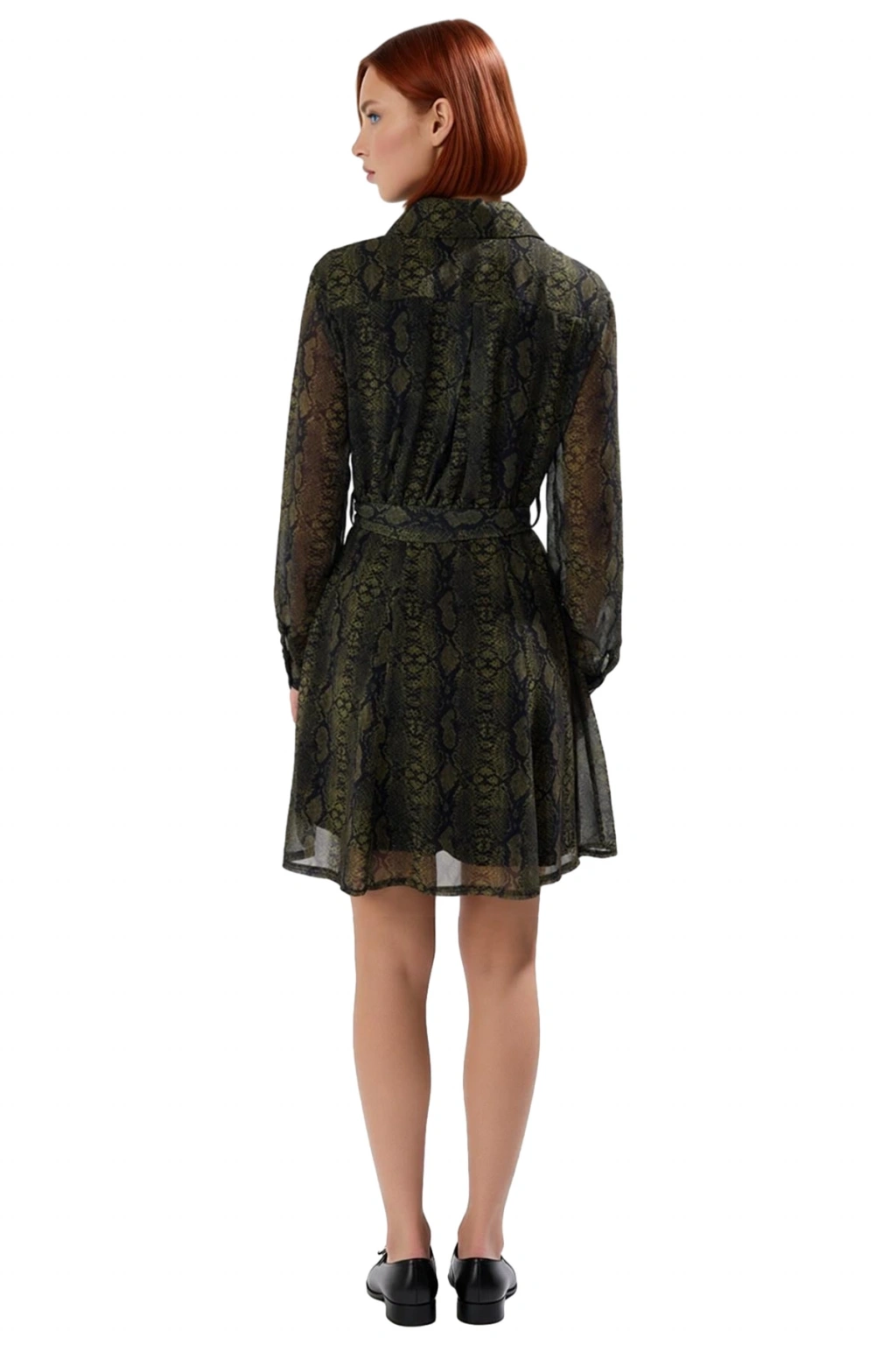 Elbisenin gömlek yaka tasarımı modern ve şık bir görünüm sunar. Uzun standart kolları, bahar ve sonbahar serinliğine karşı ideal bir koruma sağlarken, şifon dokuma kumaşı nefes alabilirliği ile sıcak havalarda bile ferahlık sunar. Yarım pat düğme kapama şekli giyimi kolaylaştırır. Eteği belden açılan skater silueti, her adımda uçuş uçuş bir etki yaratır ve hareket özgürlüğü sunar. Makinede yıkanabilir özelliği sayesinde bakımı son derece pratiktir ve dayanıklı yapısı uzun süreli kullanım imkanı tanır.