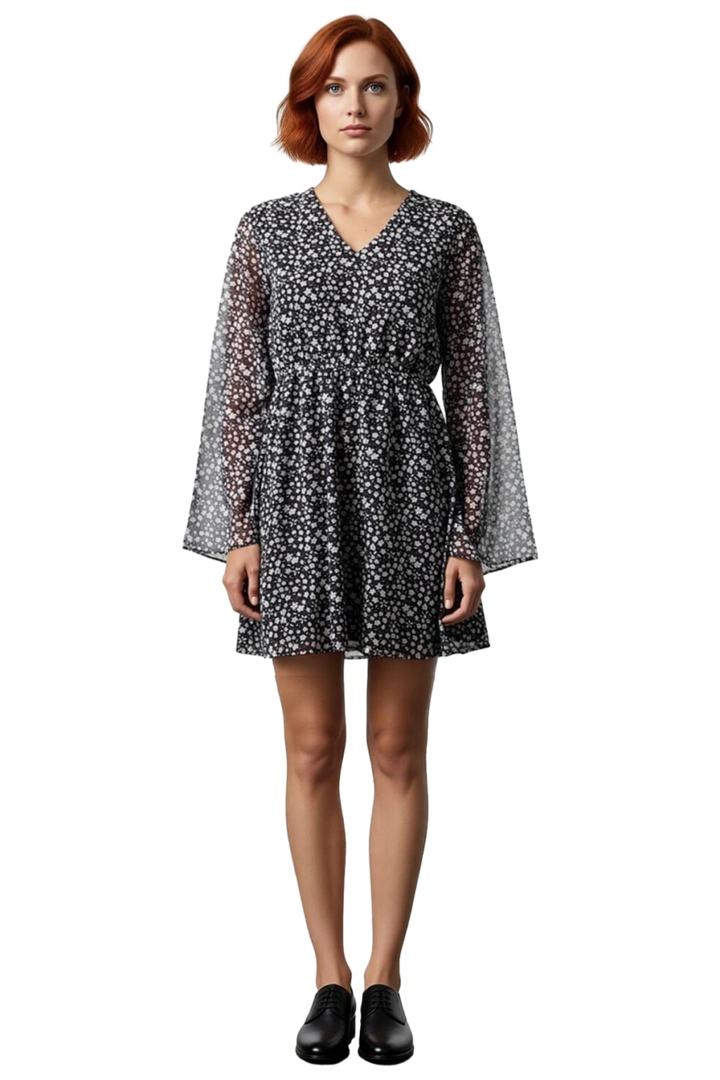Ürün Özellikleri: Skater kalıp, 100% polyester materyal, çiçek desenli, V yaka, uzun kol, şifon dokuma kumaş, çok renkli.
