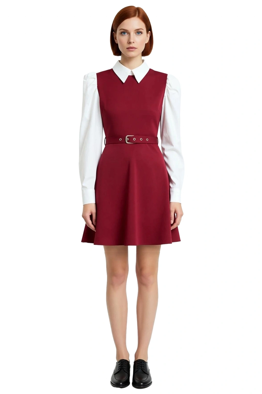 Ürün Özellikleri: Skater kalıp, polyester karışımlı materyal, renk bloklu ve baskısız desen, gömlek yaka, uzun balon kol, dokuma kumaş, bordo renk.