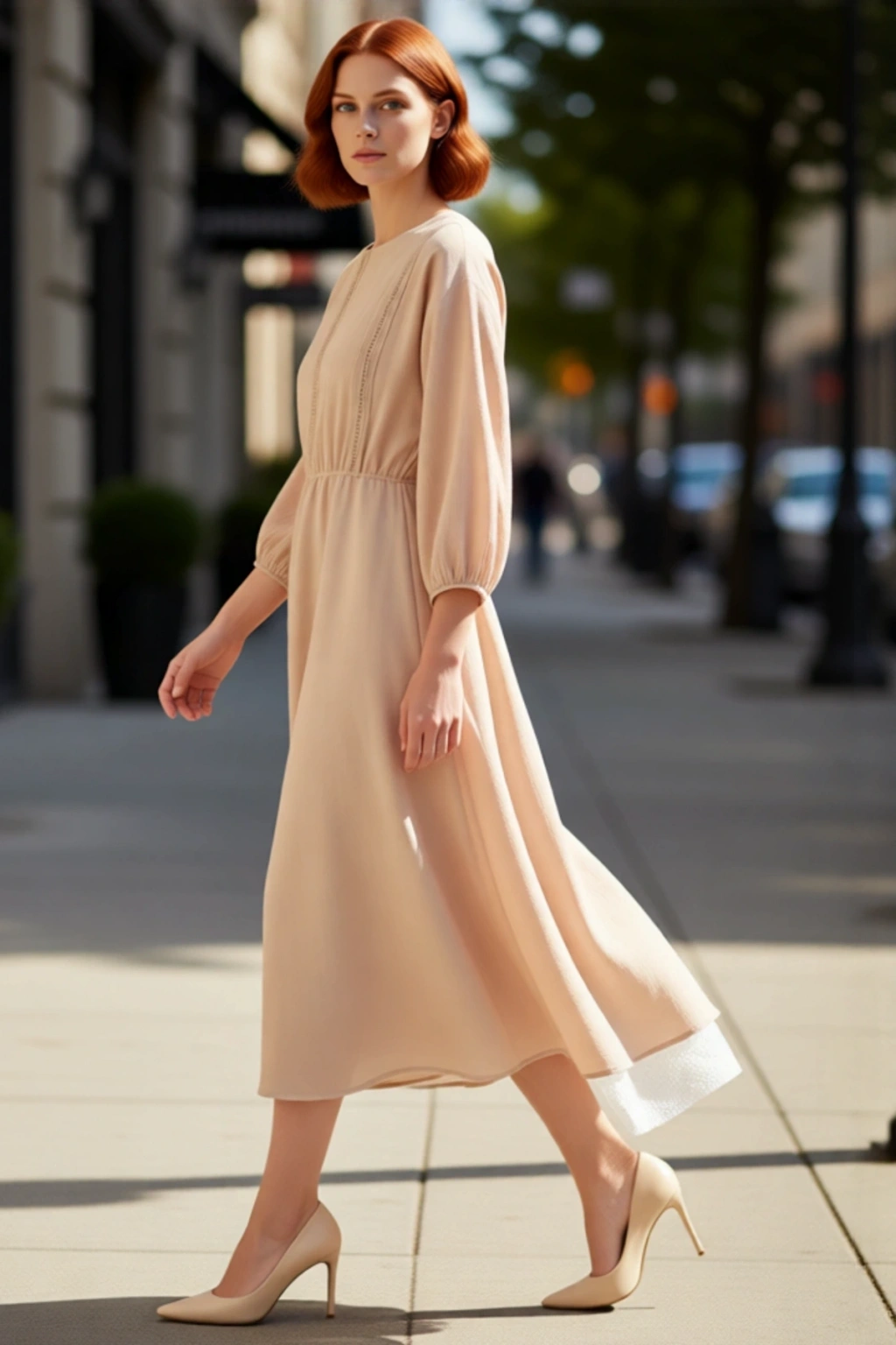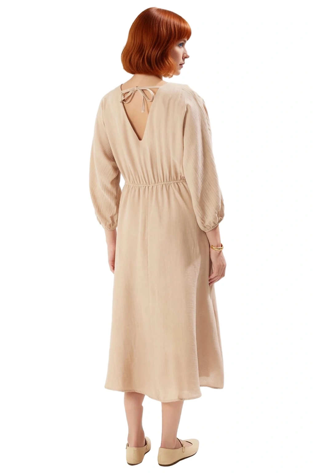 Ürün Özellikleri: Skater kalıp, %100 pamuk materyal, düz desen, bisiklet yaka, balon kol, müslin kumaş, bej renk.