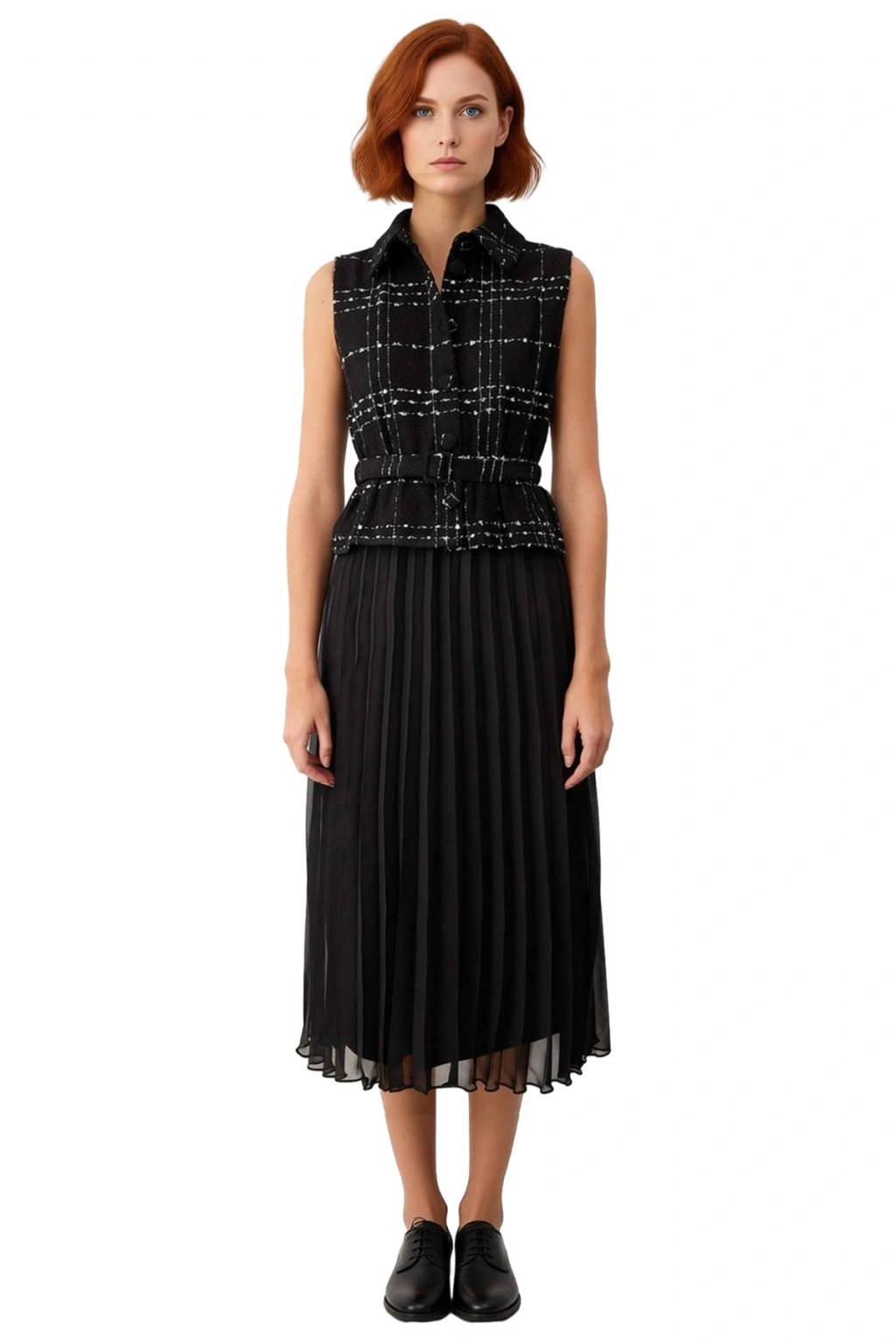 Ürün Özellikleri: Skater kalıp, %100 polyester materyal, düz desen, gömlek yaka, kolsuz, dokuma kumaş, siyah renk, piliseli detay.