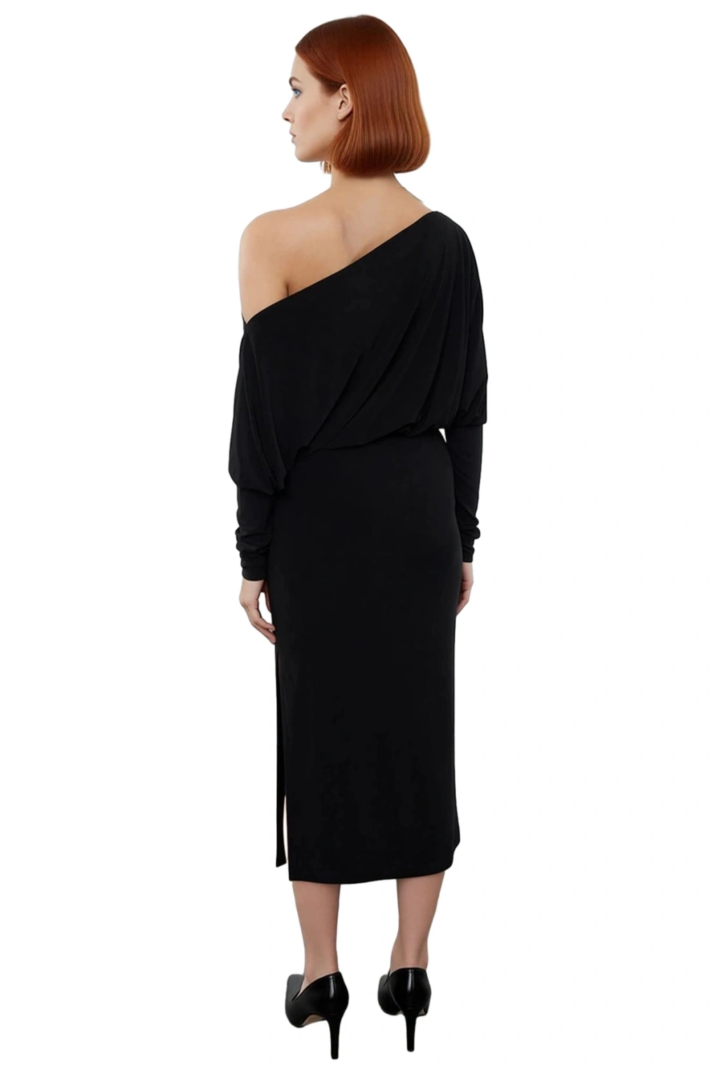 Elbisenin asimetrik yaka detayı, modern bir dokunuşla omuzları zarifçe açıkta bırakırken, düşük kol tasarımı ve uzun kol boyu hareket özgürlüğünüzü destekler. Kalın sandy dokuma tipine sahip örme kumaşı, kış mevsiminin serin günlerinde sizi sıcak tutarken, aynı zamanda yumuşak bir dokunuş sunar. Midi boyu ve bacakta yer alan yırtmaç, elbisenin dinamik yapısını güçlendirirken, astarsız yapısı hafif ve rahat bir giyim deneyimi sağlar. %96 polyester ve %4 elastan bileşimi, elbisenin formunu uzun süre korumasına yardımcı olurken, kolay bakımıyla da günlük hayatınıza pratiklik katar.