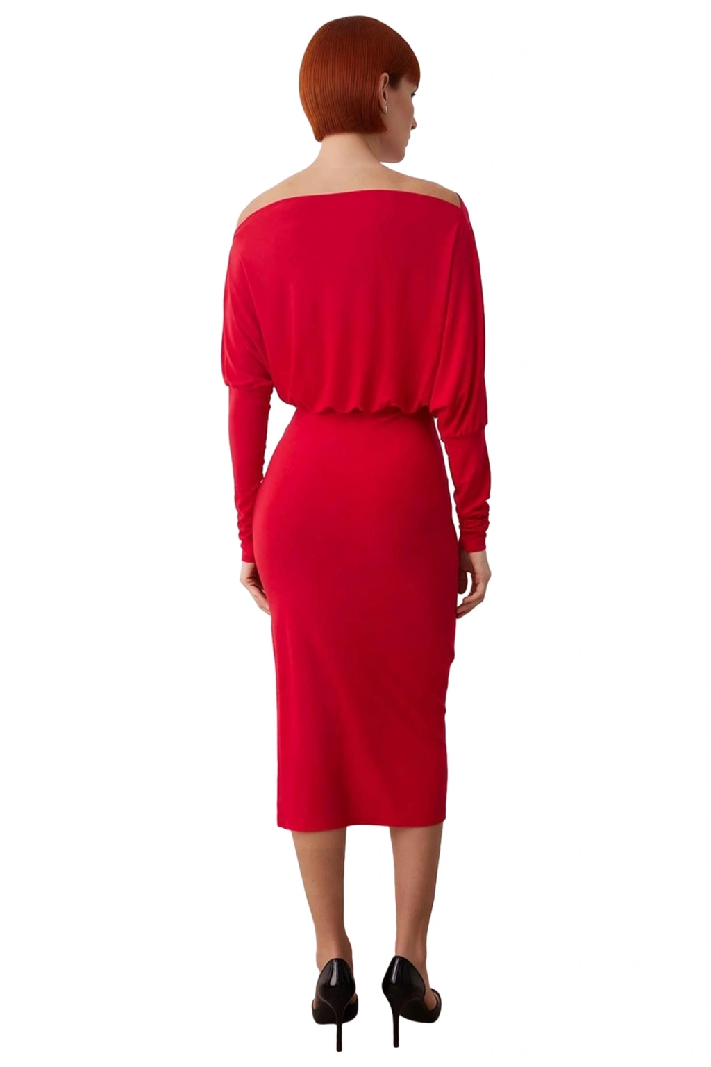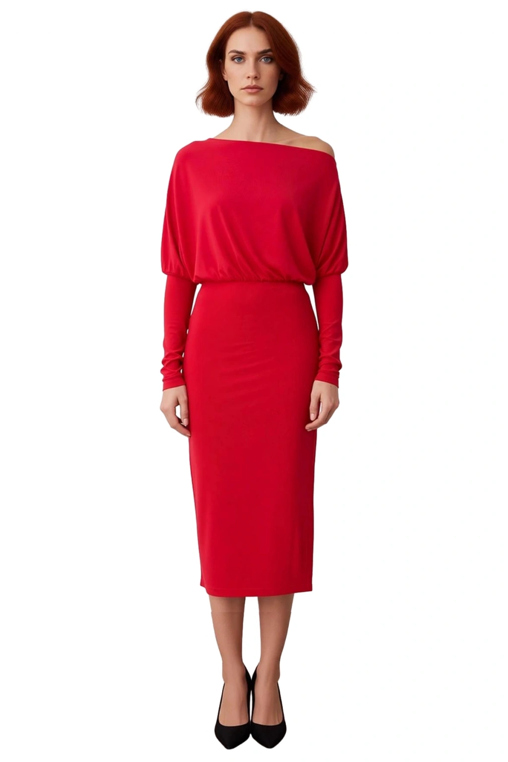 Ürün Özellikleri: Bodycon kalıp, polyester materyal, düz desen, asimetrik yaka, düşük kol, örme kumaş, kırmızı renk, yırtmaç detaylı tasarım.