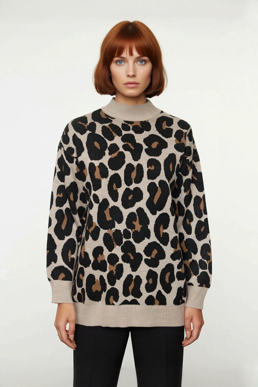 Bu çarpıcı kadın triko kazak, relaxed kalıbı sayesinde modern ve salaş bir görünüm sunarken, gün boyu üst düzey konfor sağlar. 100% akrilik materyalden özenle üretilen bu parça, kış aylarının vazgeçilmezi olarak sıcaklık ve yumuşaklık hissini bir arada sunar. Animal deseni, stilinize cesur ve dinamik bir hava katarken, bej tonları sayesinde farklı renklerle kolayca uyum yakalar. Jakar dokuma kalitesi, desenin canlılığını ve ürünün dayanıklılığını artırır, böylece uzun yıllar keyifle giyilebilir ve Cool & Comfort personasını en iyi şekilde yansıtır.