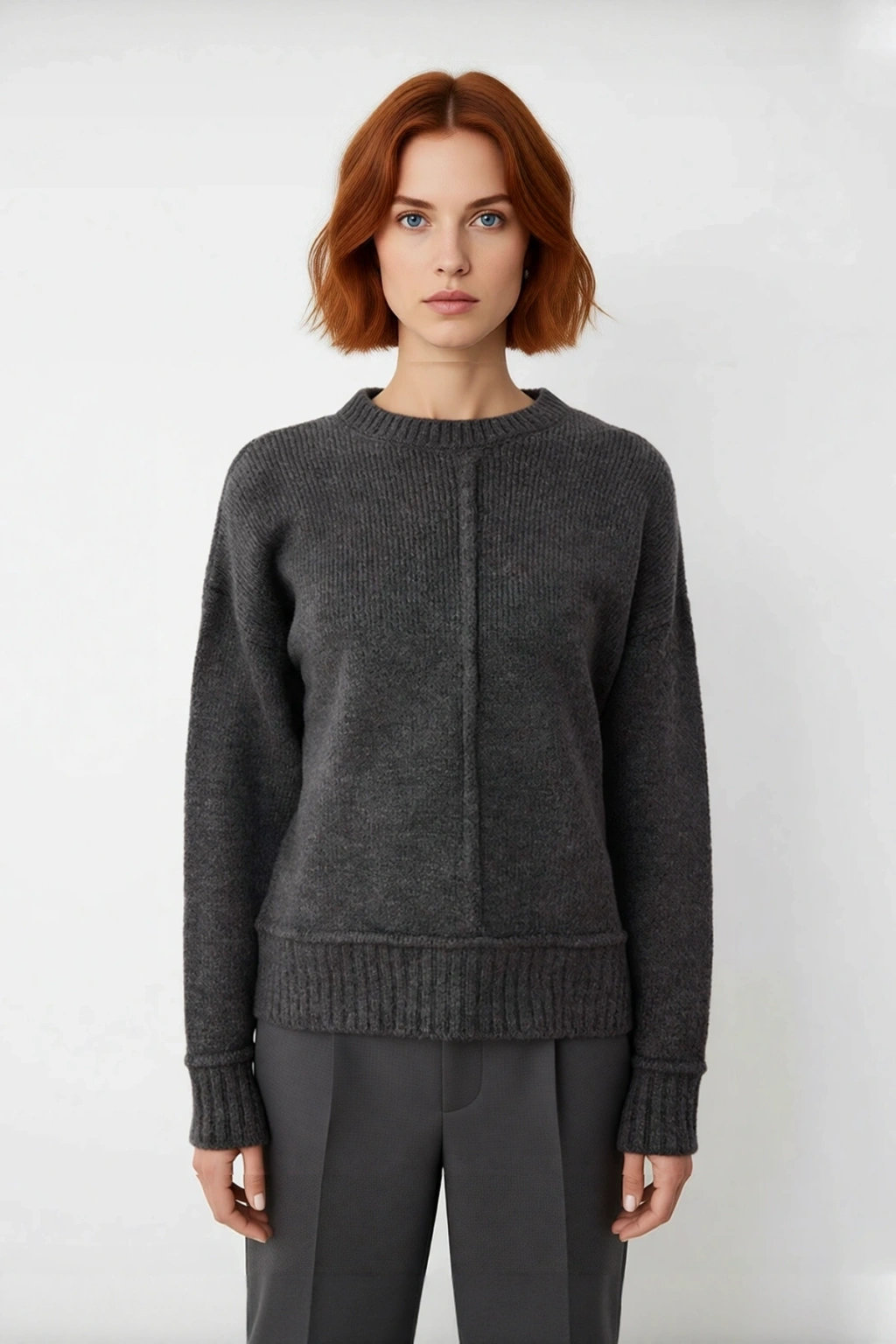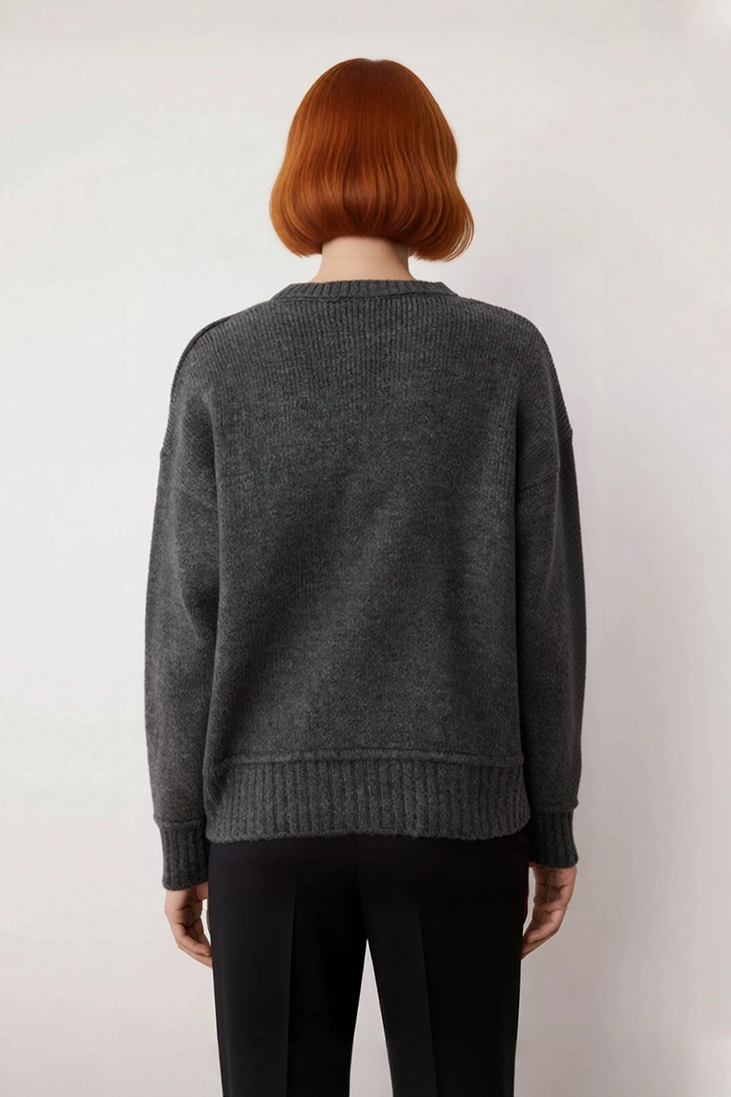 Ürün Özellikleri: Oversize kalıp, 75% Akrilik 22% Polyester 3% Elastan materyal, düz desen, bisiklet yaka, düşük kol, triko kumaş, gri renk, baskısız tasarım.