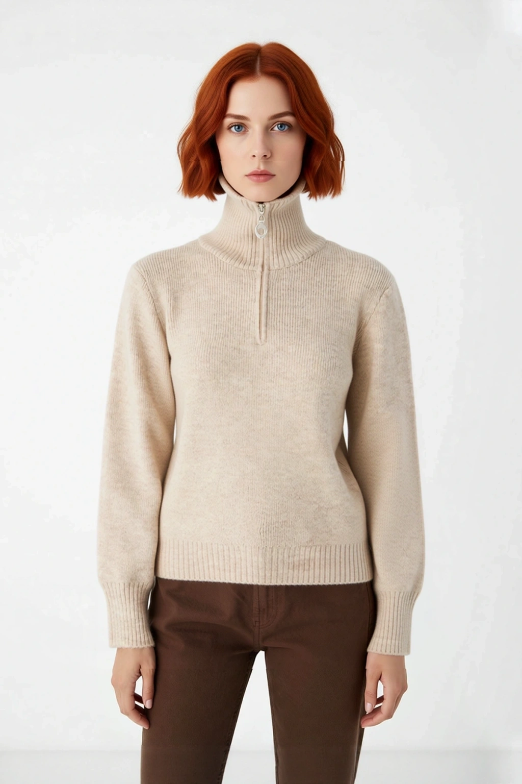 Kazağın fermuarlı dik yaka detayı, hem şık bir görünüm sunar hem de boyun bölgenizi soğuktan korur. Standart kol tipi ve uzun kol boyu, rahat hareket imkanı sağlarken modern bir duruş sergiler. Selanik dokuma tipi, kazağa benzersiz bir tekstür kazandırırken, triko kumaşın esnekliği ve dayanıklılığı uzun süreli kullanım vaat eder. Bakım kolaylığı sayesinde pratik bir kullanım sunar ve formunu uzun süre muhafaza eder. Bu kazak casual/günlük ortamlar için mükemmel bir seçimdir.