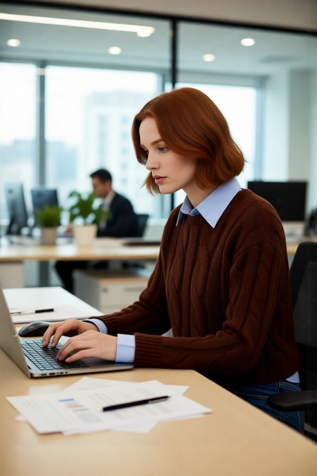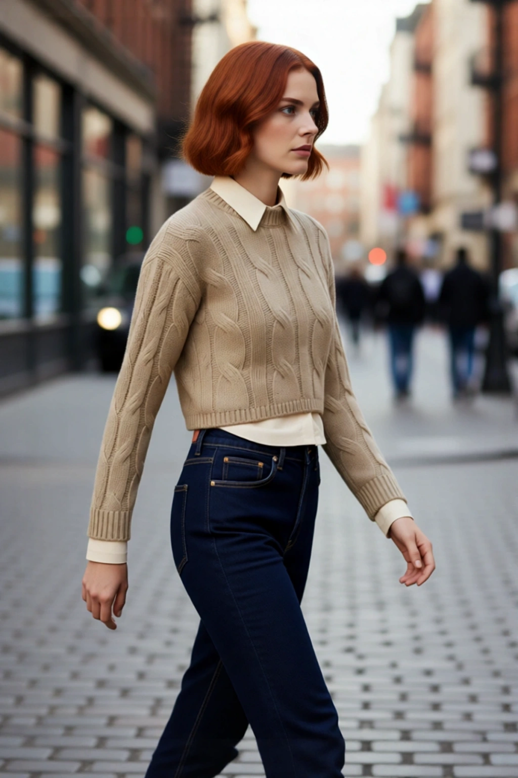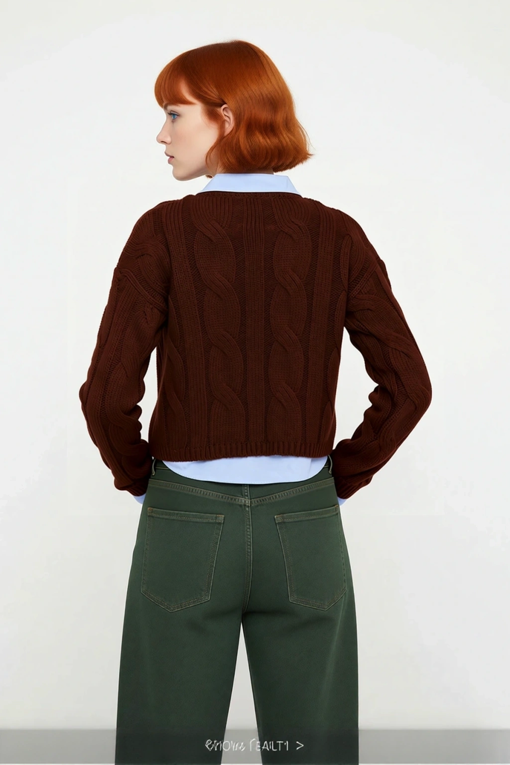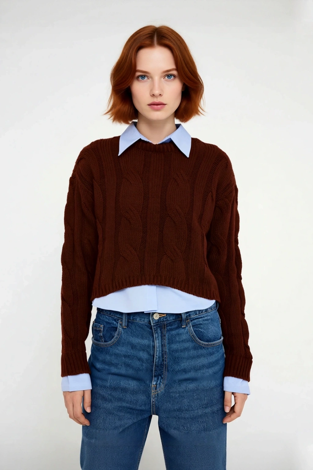 Ürün Özellikleri: Regular kalıp, 100% akrilik materyal, saç örgü desen, bisiklet yaka, düşük kol, triko kumaş, kahverengi renk, super crop boy.