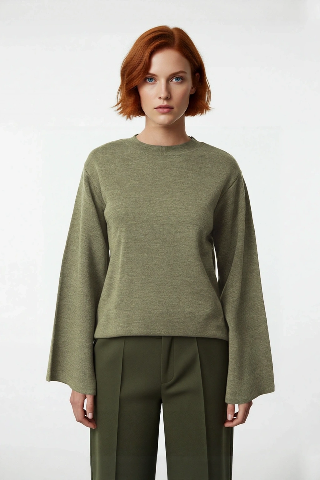 Ürün Özellikleri: Regular kalıp, akrilik materyal, düz desen, bisiklet yaka, İspanyol kol, triko kumaş, haki renk, sürdürülebilir.