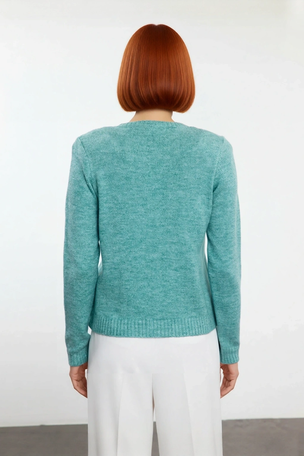 Ürün Özellikleri: Regular kalıp, akrilik polyester karışımı materyal, düz desen (taş işlemeli), bisiklet yaka, standart kol, triko kumaş, mint yeşili renk, baskısız tasarım.
