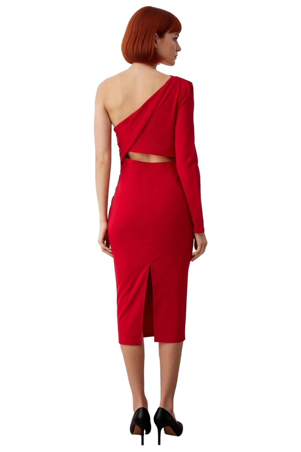 Ürün Özellikleri: Bodycon kalıp, 86% Polyester 14% Elastan materyal, düz desen, asimetrik yaka, tek kol uzun kol, dokuma kumaş, kırmızı renk, astarsız, midi boy.