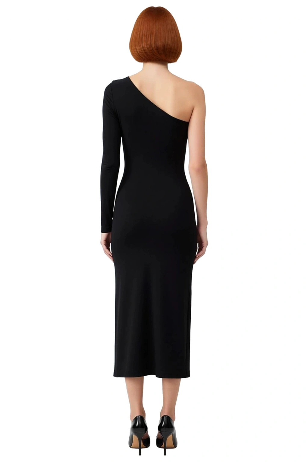 Ürün Özellikleri: Bodycon kalıp, %96 polyester %4 elastan materyal, düz desen, asimetrik yaka, tek kol, uzun kol boyu, örme sandy kumaş, astarlı, aksesuar detaylı.