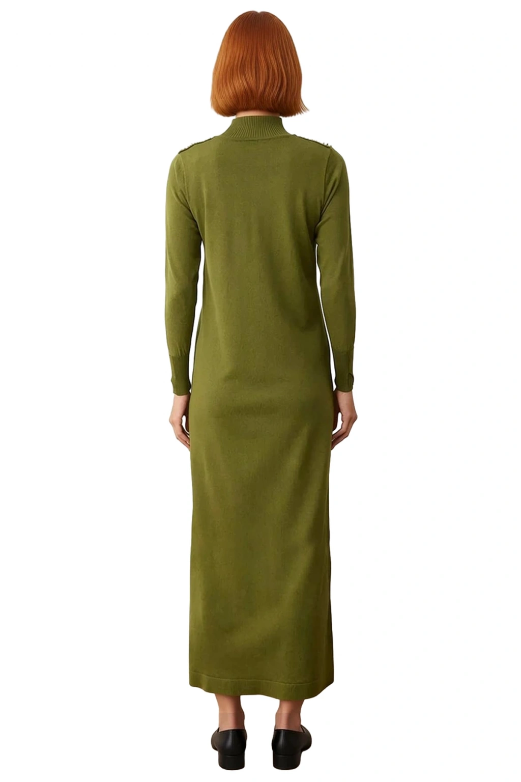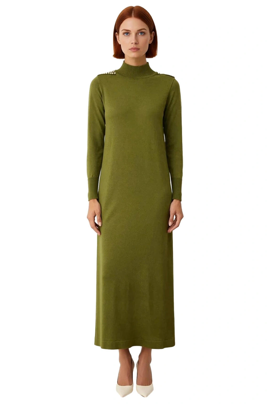 Ürün Özellikleri: A-line kalıp, 70% viskoz 30% poliamid materyal, düz desen, dik yaka, standart kol, triko kumaş, haki renk, incili detay.