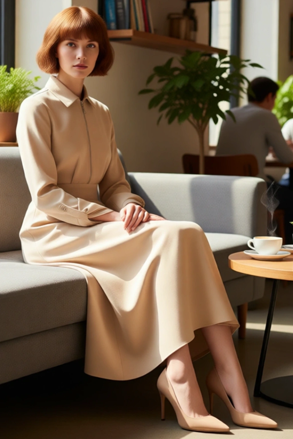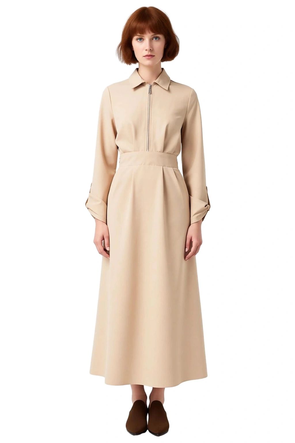 Ürün Özellikleri: A-line kalıp, %67 Polyester %33 Pamuk materyal, düz desen, gömlek yaka, standart kol, dokuma kumaş, bej renk.