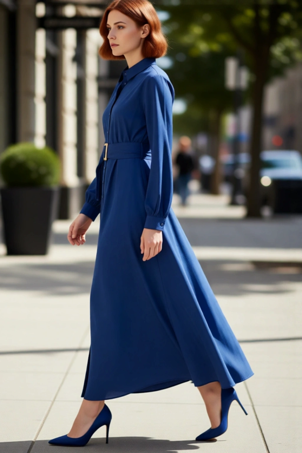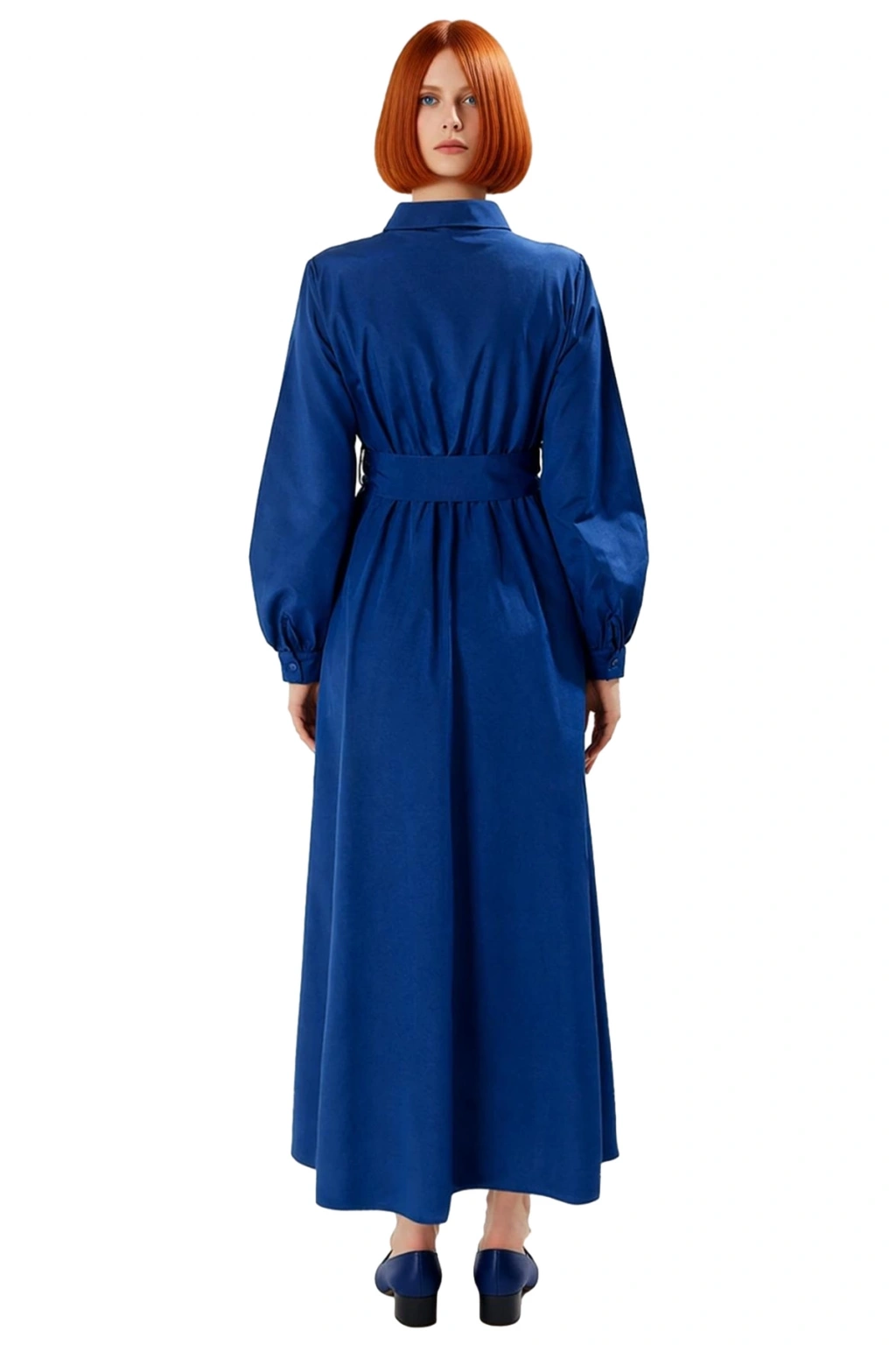 Ürün Özellikleri: Gömlek elbise kalıp, polyester materyal, düz desen, gömlek yaka, standart kol, dokuma kumaş, mavi renk, kuşaklı tasarım.