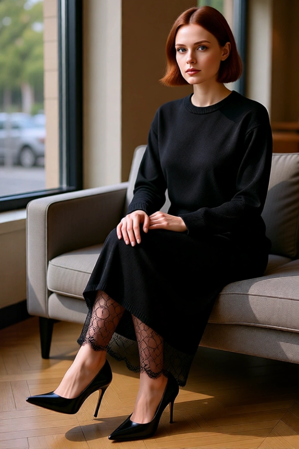 Ürün Özellikleri: A-line kalıp, 100% akrilik materyal, düz desen (dantel detaylı), bisiklet yaka, standart uzun kol, triko kumaş, siyah renk.