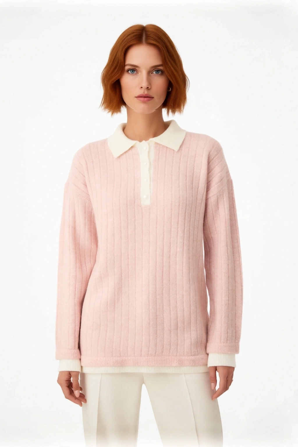 Ürün Özellikleri: Regular kalıp, %75 Akrilik %25 Polyester materyal, renk bloklu desen, polo yaka, düşük kol, triko kumaş, pembe renk.