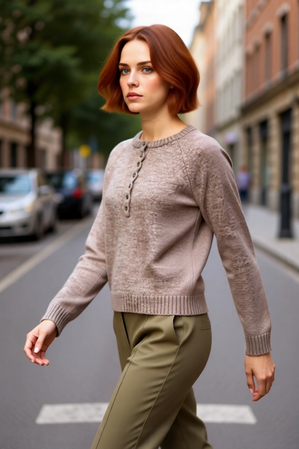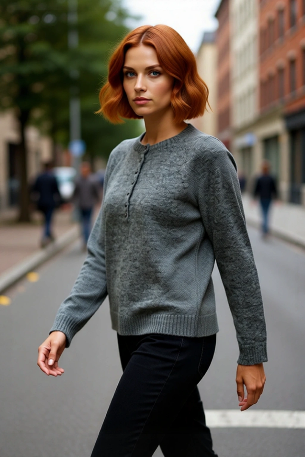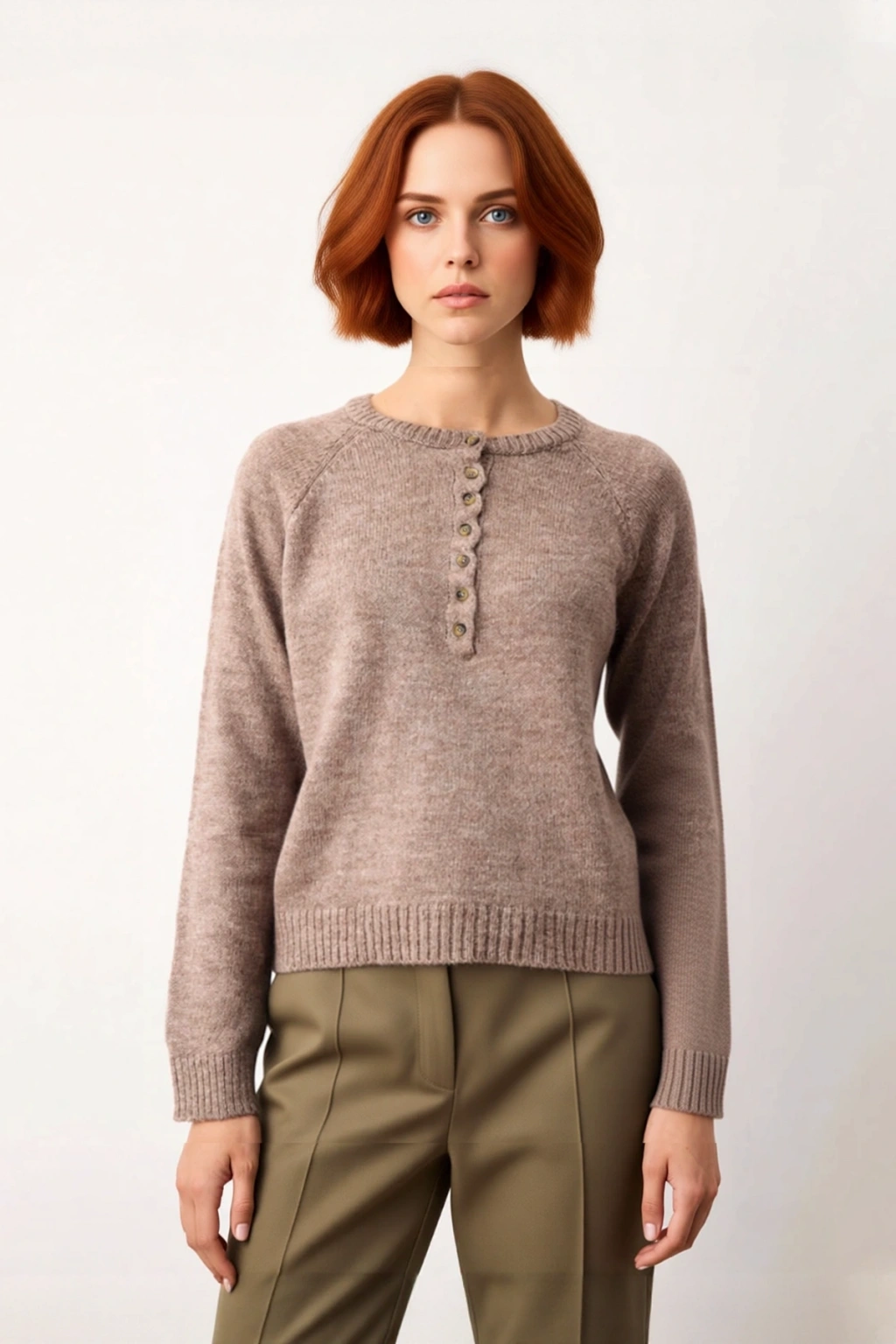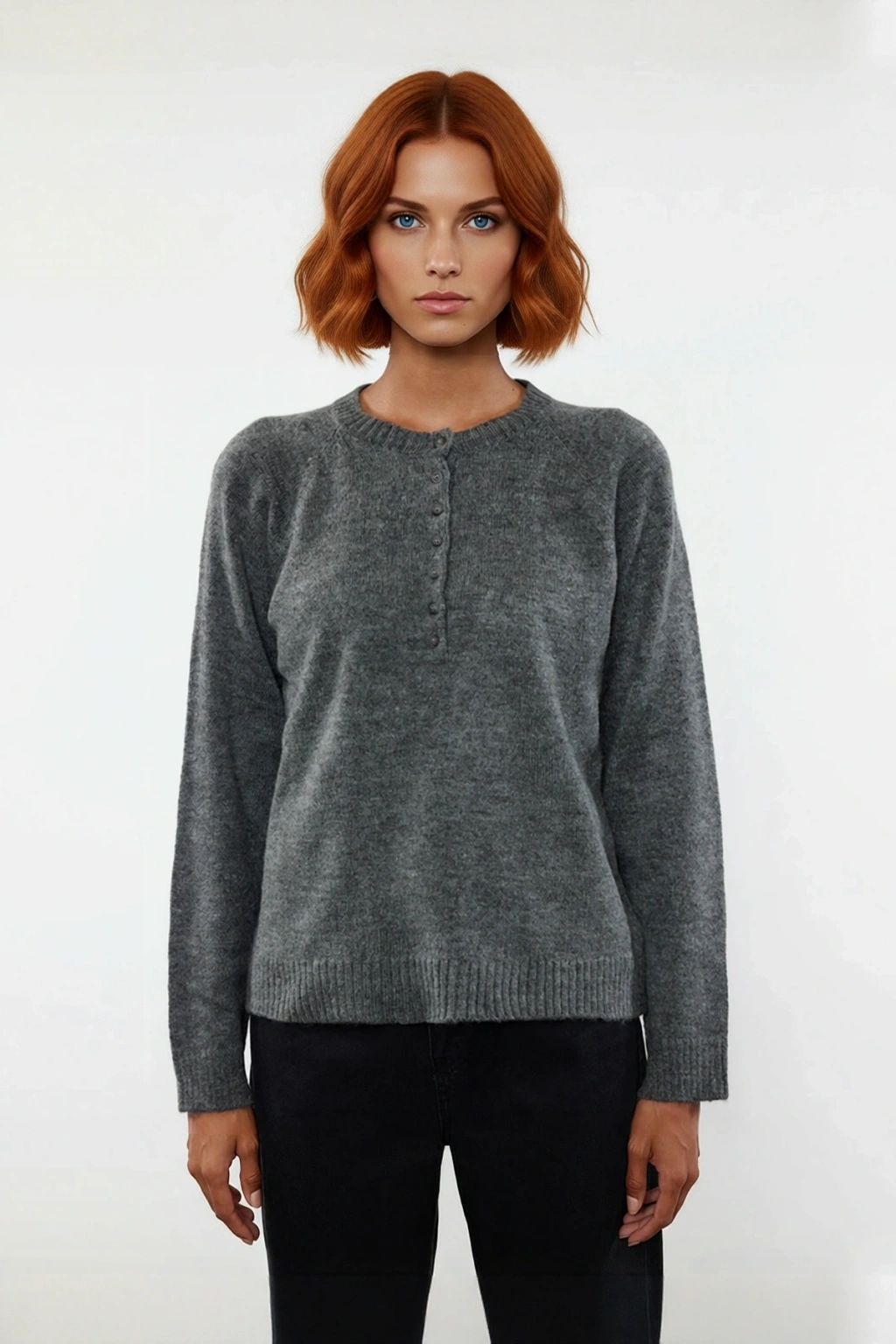 Kazağın ön kısmında bulunan düğme detaylı bisiklet yaka, klasik bir dokunuşla modernliği birleştirerek dikkat çekici bir estetik sunar. Bu özgün yaka tasarımı, kazağa kolayca giyilip çıkarılabilirlik özelliği de katar. Reglan kol tipi, omuzlarda rahat bir duruş sağlayarak kolların doğal hareketini destekler ve gün boyu konforlu bir deneyim sunar. Orta kalınlıktaki triko kumaş tipi, kış aylarının soğuklarına karşı etkili bir koruma sağlarken, nefes alabilen yapısıyla iç mekanlarda da rahatlıkla kullanılabilir. Tek plaka dokuma ve kaliteli materyal, bu kazağın uzun yıllar boyunca formunu koruyacağının göstergesidir.