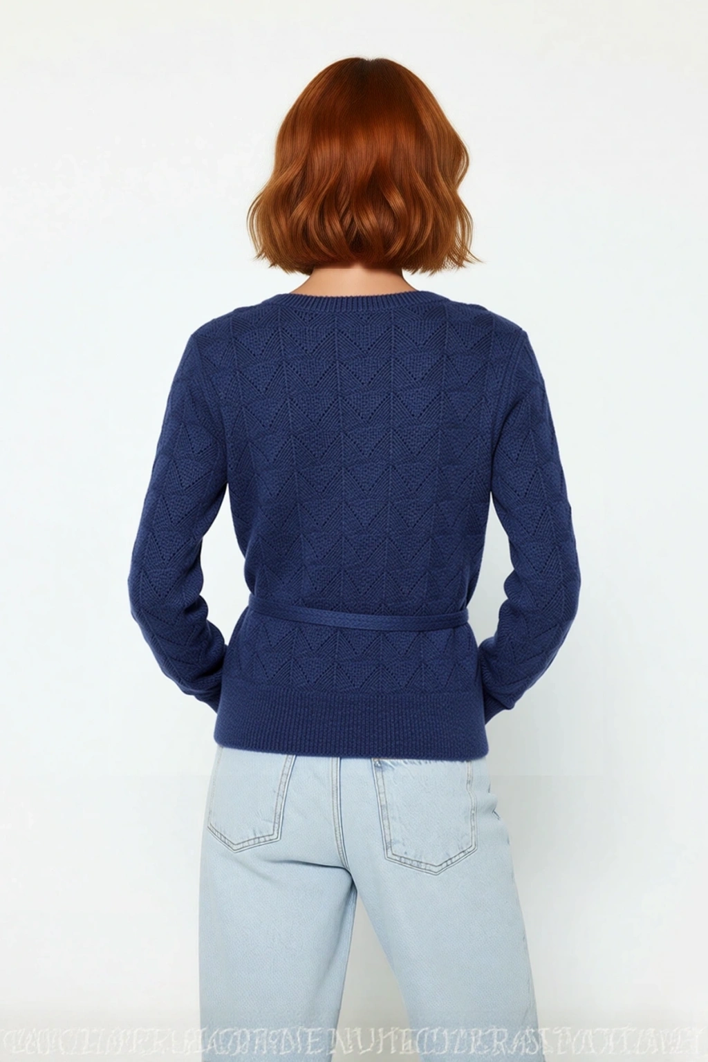 Ürün Özellikleri: Regular kalıp, 79% akrilik 21% polyester materyal, ajurlu desen, kruvaze yaka, standart kol, triko kumaş, mavi renk.