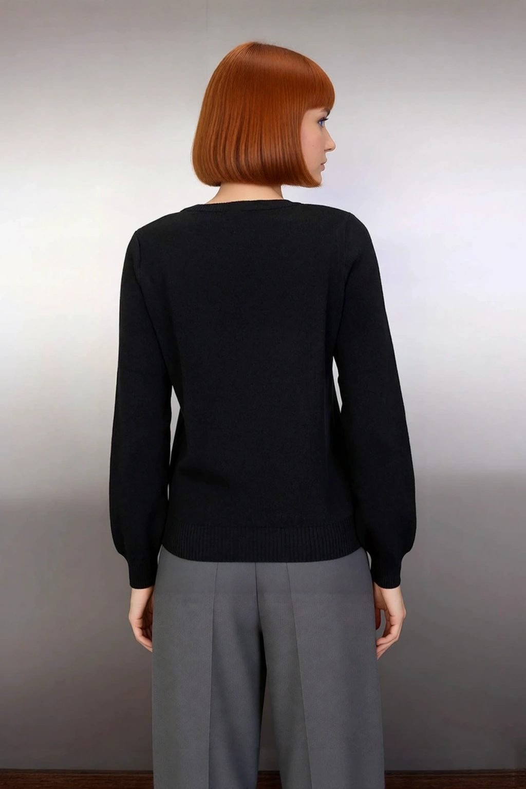 Ürün Özellikleri: Regular kalıp, akrilik polyester viskoz materyal, nakışlı inci kurdele desen, bisiklet yaka, standart uzun kol, orta kalınlık triko kumaş, siyah renk.