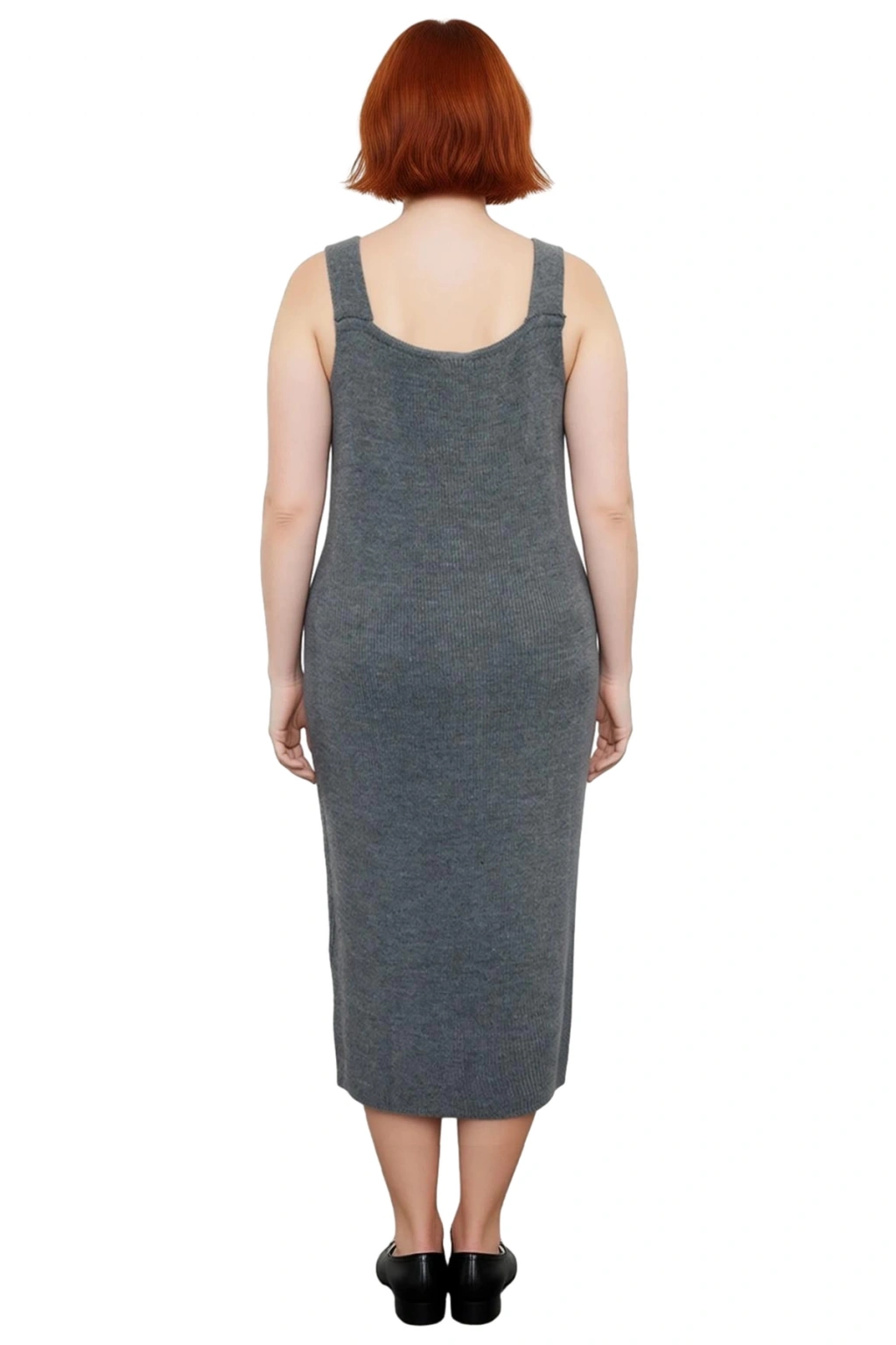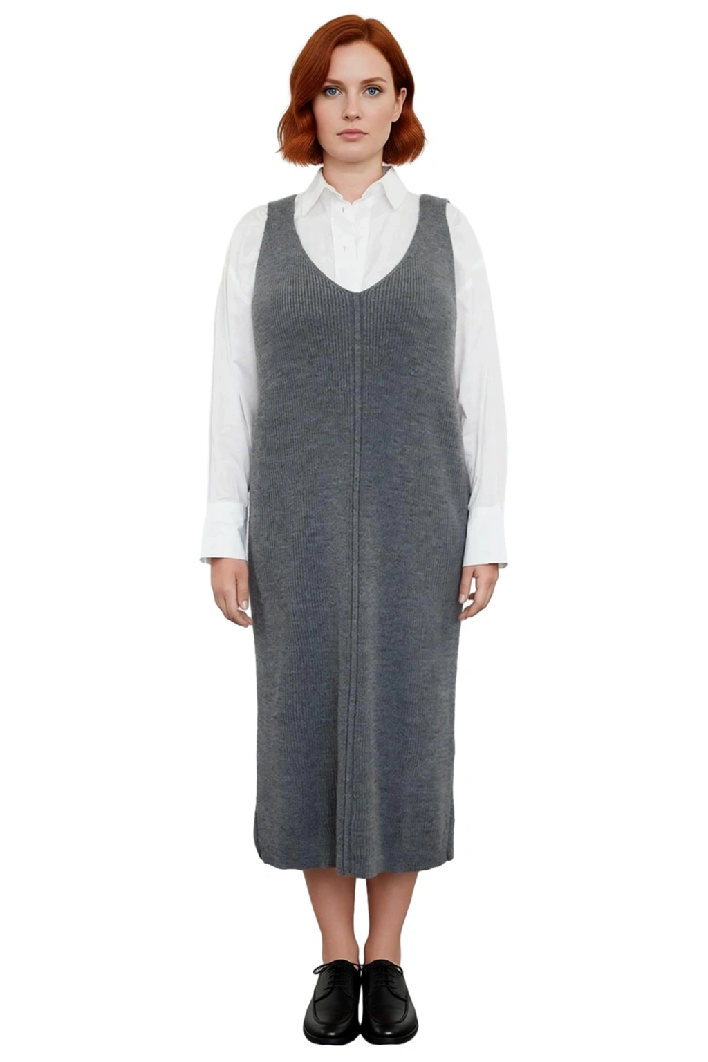 Ürün Özellikleri: Shift kalıp, akrilik materyal, düz desen, V yaka, kolsuz, triko kumaş, gri renk.