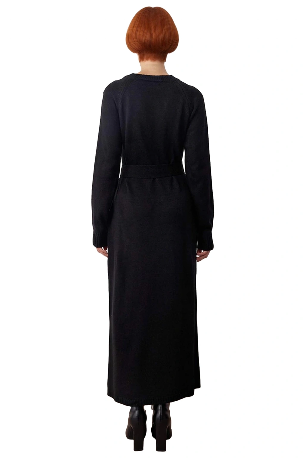 Ürün Özellikleri: A-line kalıp, %100 akrilik materyal, düz desen, bisiklet yaka, standart uzun kol, triko kumaş, siyah renk.