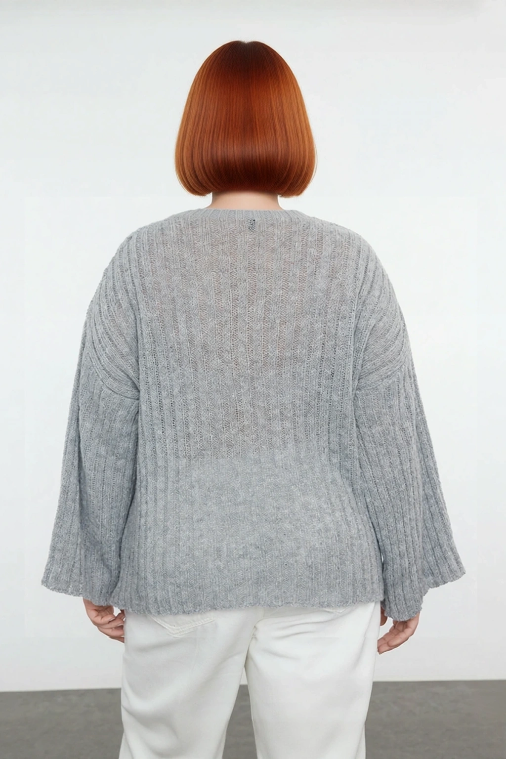 Ürün Özellikleri: Regular kalıp, yünlü karışım materyal, düz desen, V yaka, düşük kol, fitilli triko kumaş, gri renk.