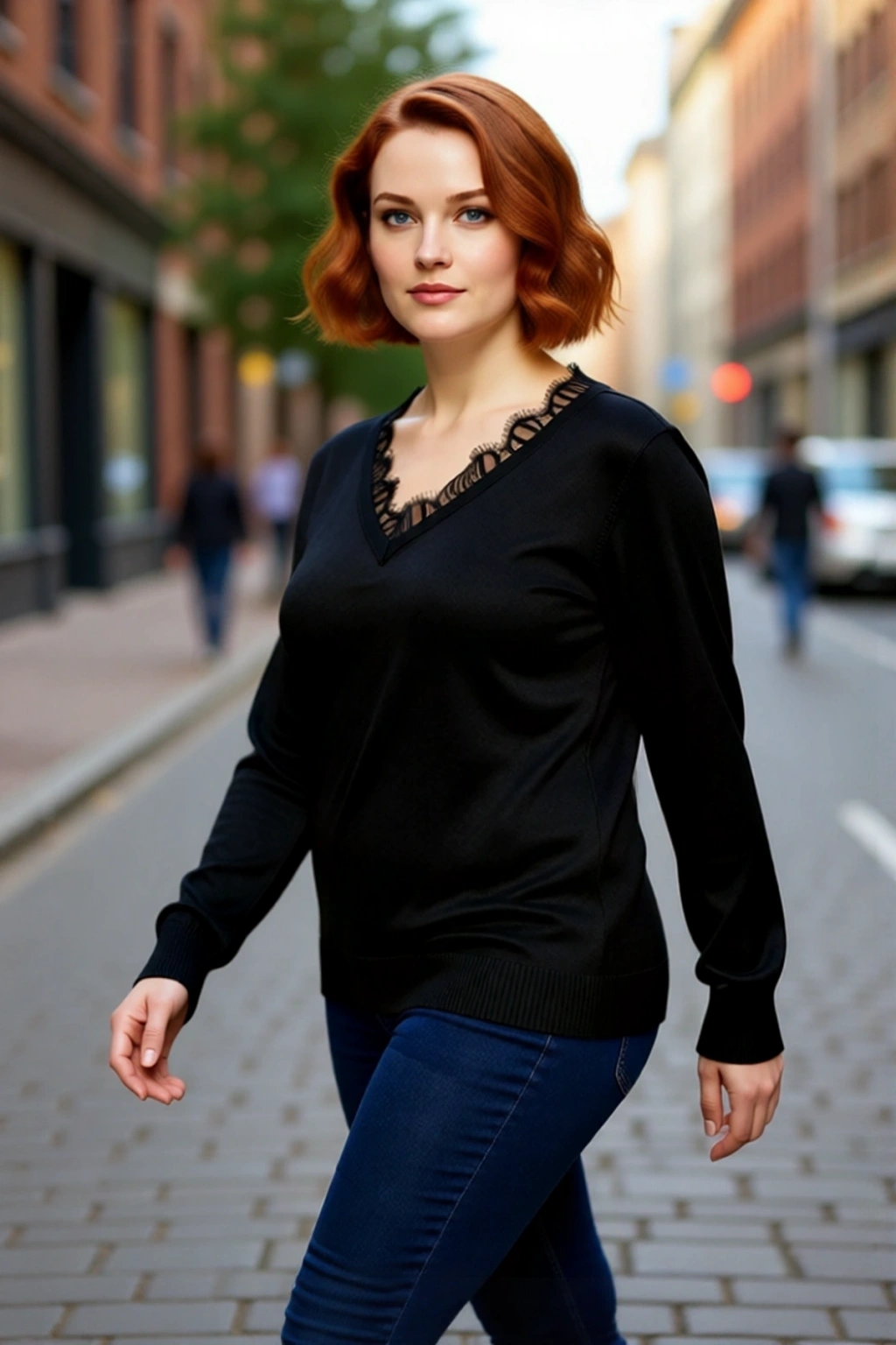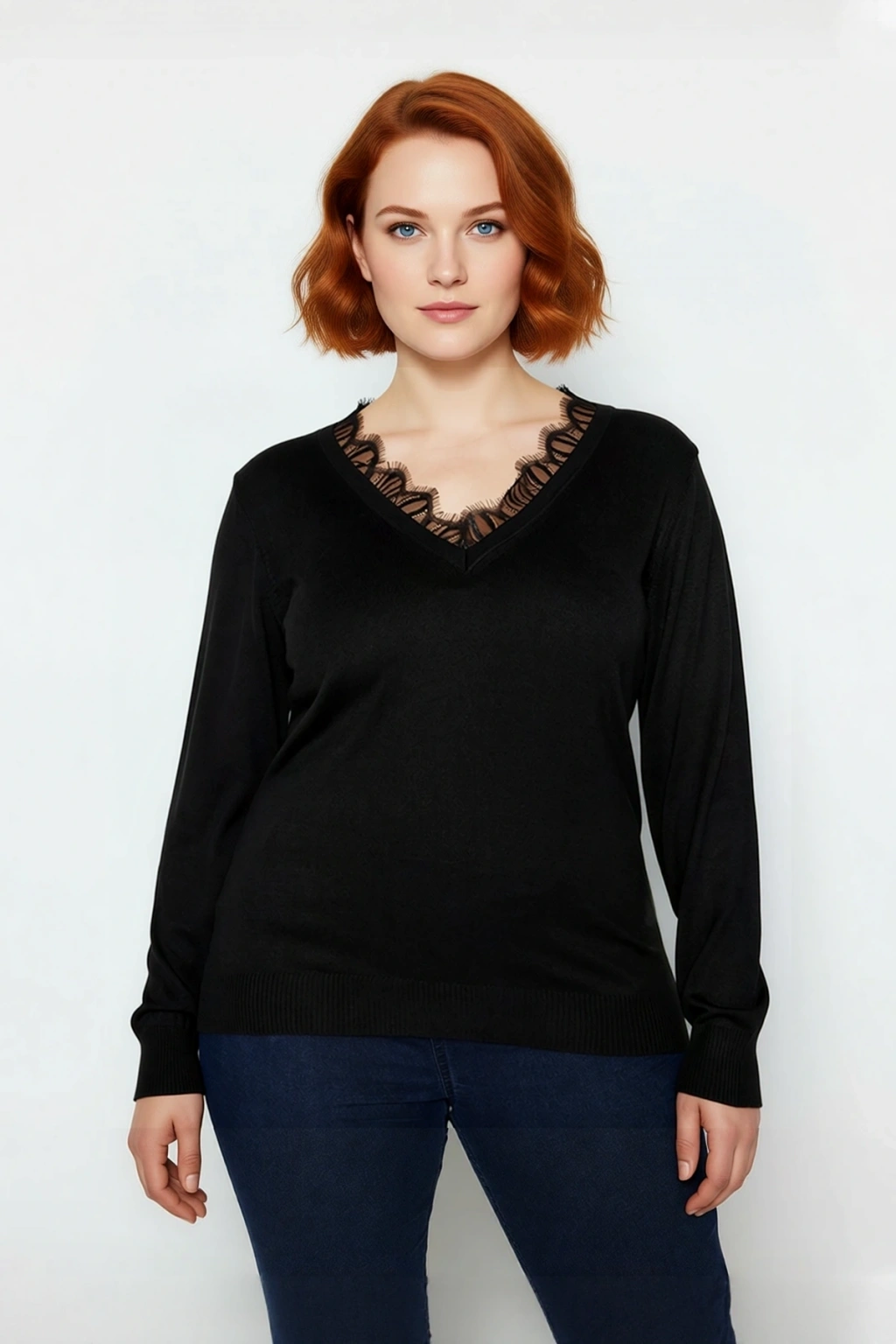 Bu kadın triko kazak, regular kalıbıyla vücuda nazikçe oturarak hareket özgürlüğü ve gün boyu süren rahatlık sunar. %51 viskoz ve %49 akrilik içeren kaliteli triko materyali, ipeksi yumuşaklığı ile cildinize dokunurken, ince dokusuyla her mevsim rahatlıkla giyilebilirlik sağlar. Klasik siyah rengi ve düz deseni, V yaka çevresindeki zarif dantel detaylarıyla birleşerek sade şıklığı modern bir dokunuşla zenginleştirir. Bu kazak, günlük yaşamın koşturmacasında bile kendinizi özel ve bakımlı hissetmenizi sağlayacak ideal bir parçadır.