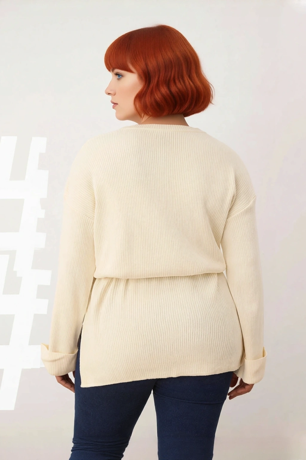 Ürün Özellikleri: Relaxed kalıp, %100 akrilik materyal, düz desen, bisiklet yaka, düşük kol, triko kumaş, ekru renk.
