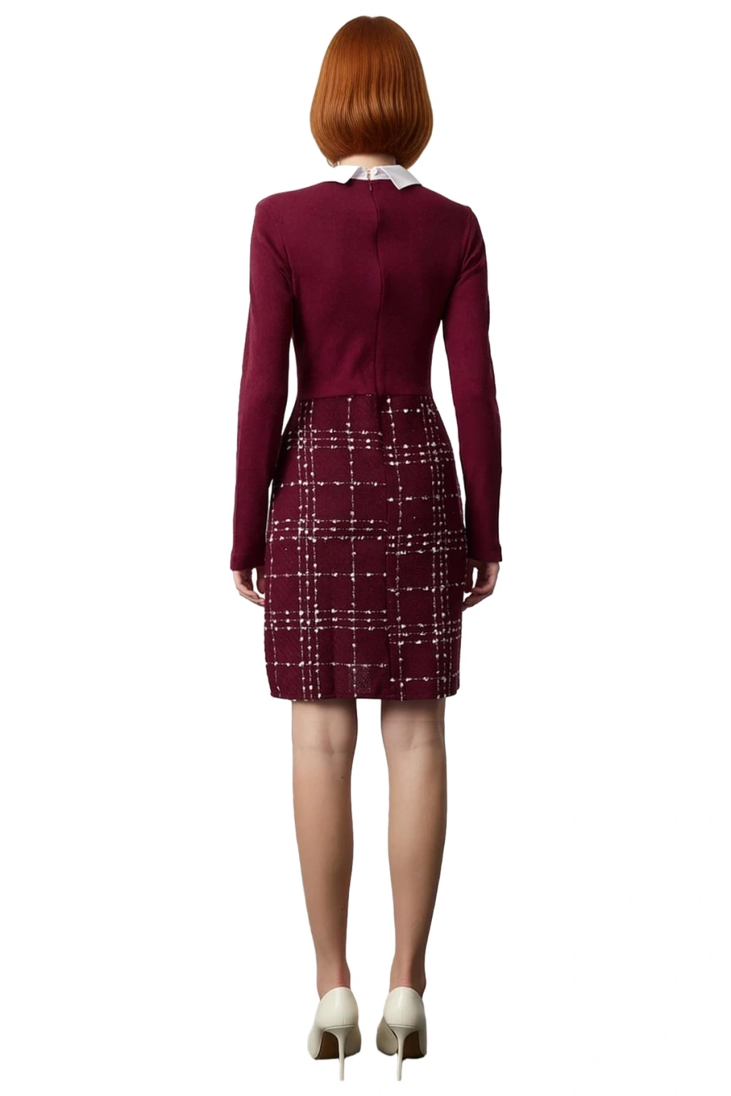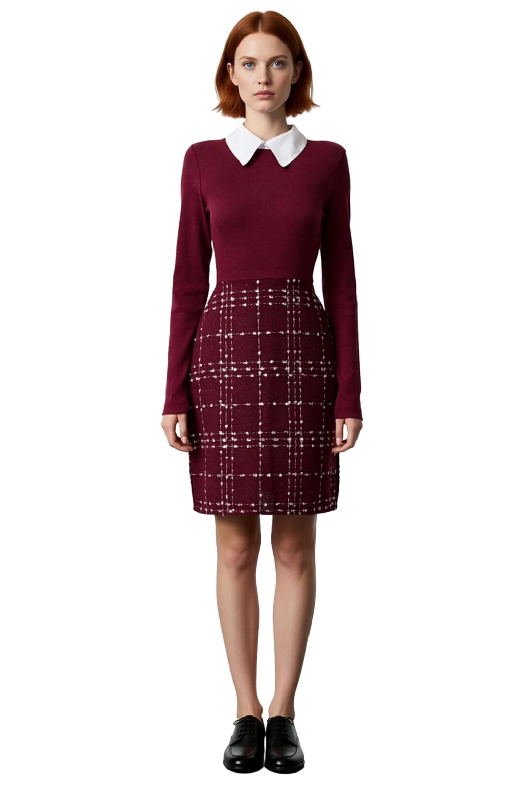 Ürün Özellikleri: A-line kalıp, polyester materyal, ekose kareli desen, gömlek yaka, standart kol, dokuma tüvit kumaş, bordo renk, örme detaylı tasarım.