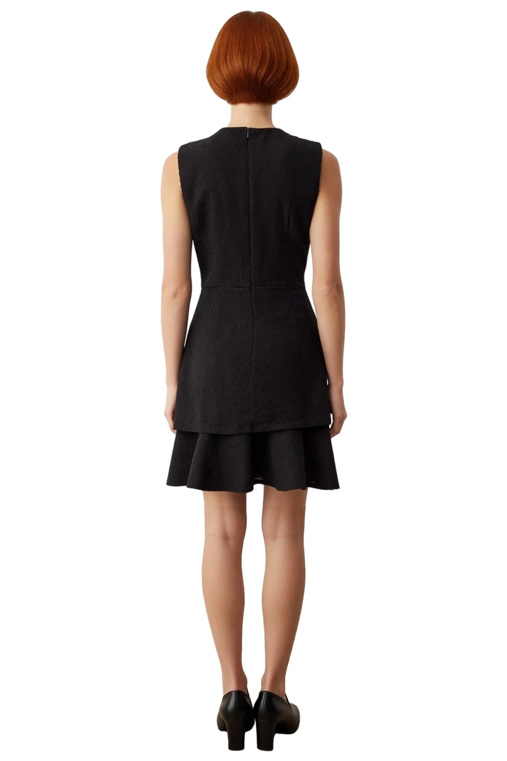 Ürün Özellikleri: A-line kalıp, polyester karışımlı tüvit materyal, düz desen, bisiklet yaka, kolsuz, dokuma kumaş, siyah renk, düğmeli detay.