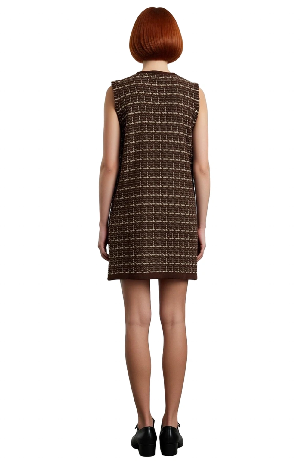 Ürün Özellikleri: Shift kalıp, akrilik materyal, dokulu desen, bisiklet yaka, kolsuz, triko kumaş, kahverengi renk.